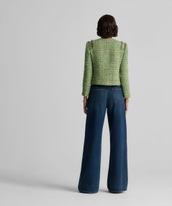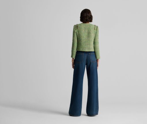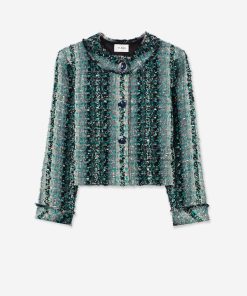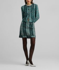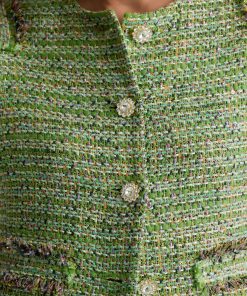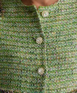 The Arden takes a timeless tweed staple to glamorous new heights. Made in our metallic striped Lenox Tweed and embellished with bejeweled buttons and fringe detail, this crewneck, straight sleeve jacket makes for a striking addition to your evening wear collection.