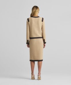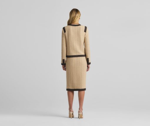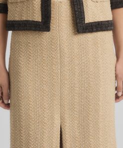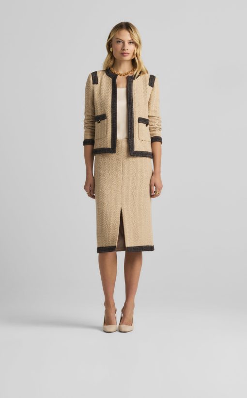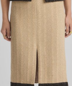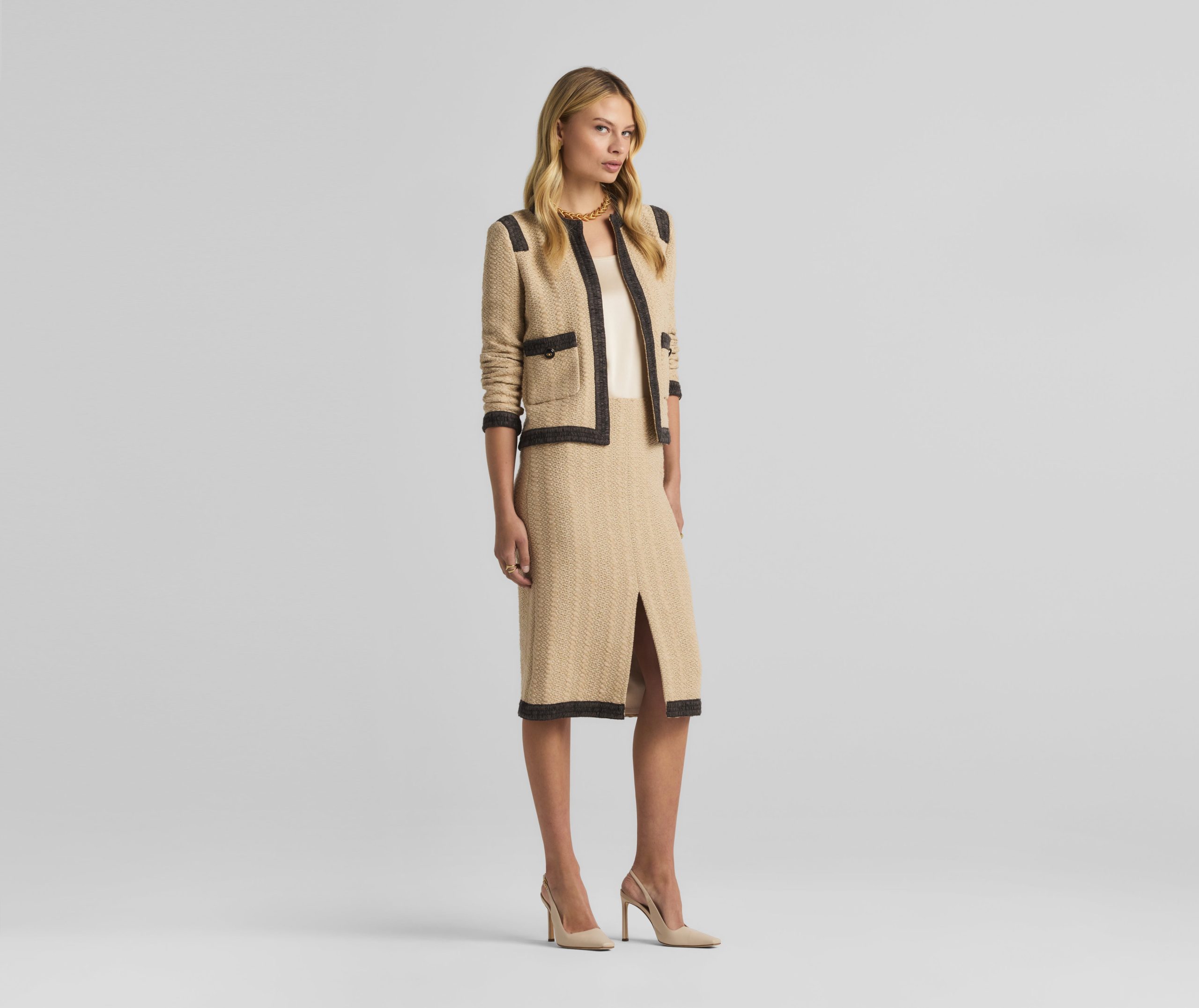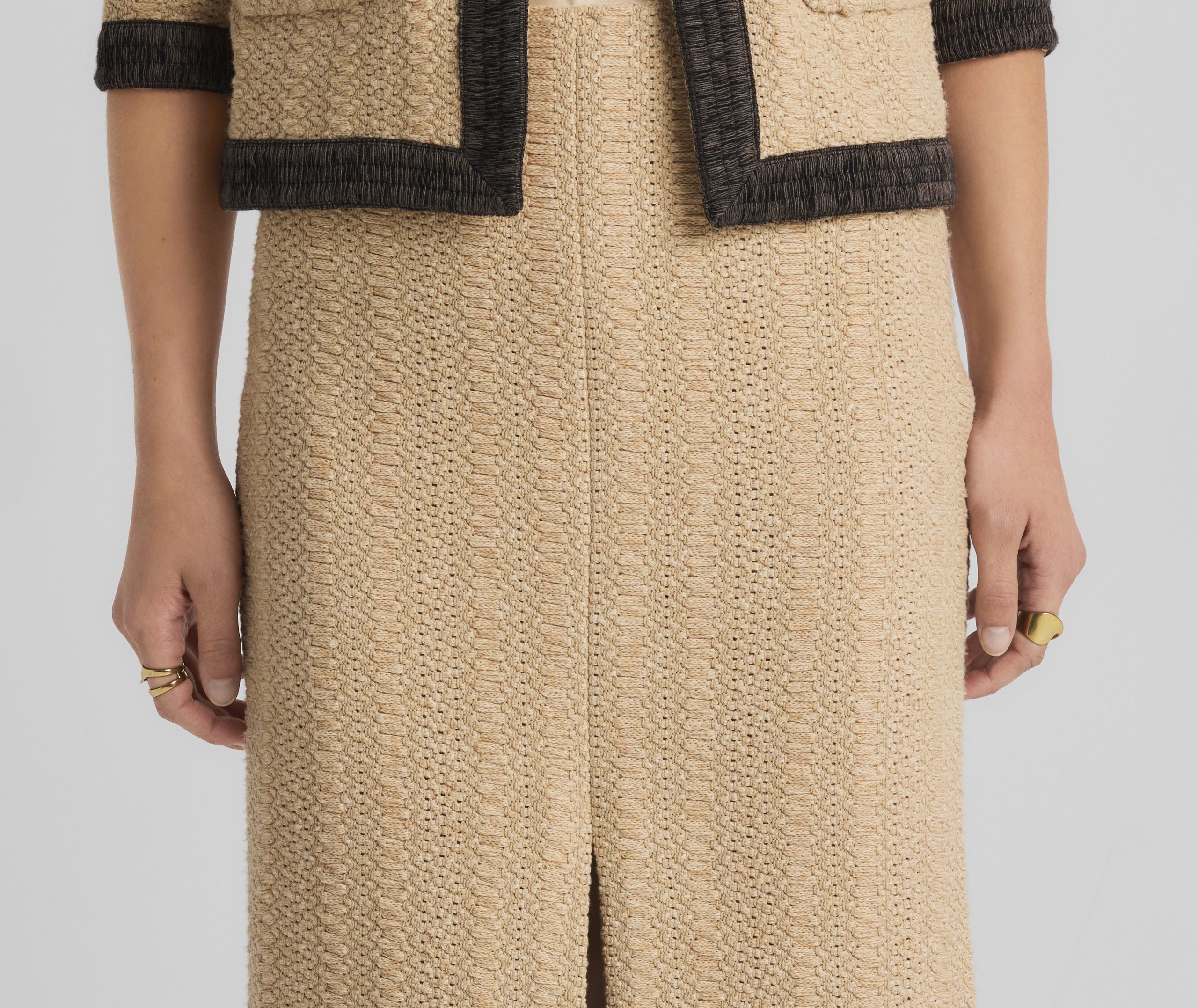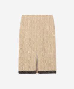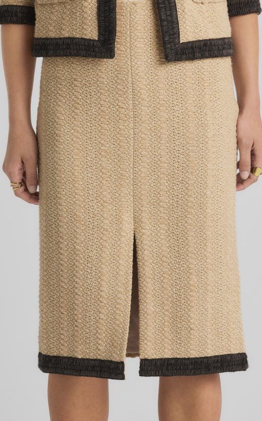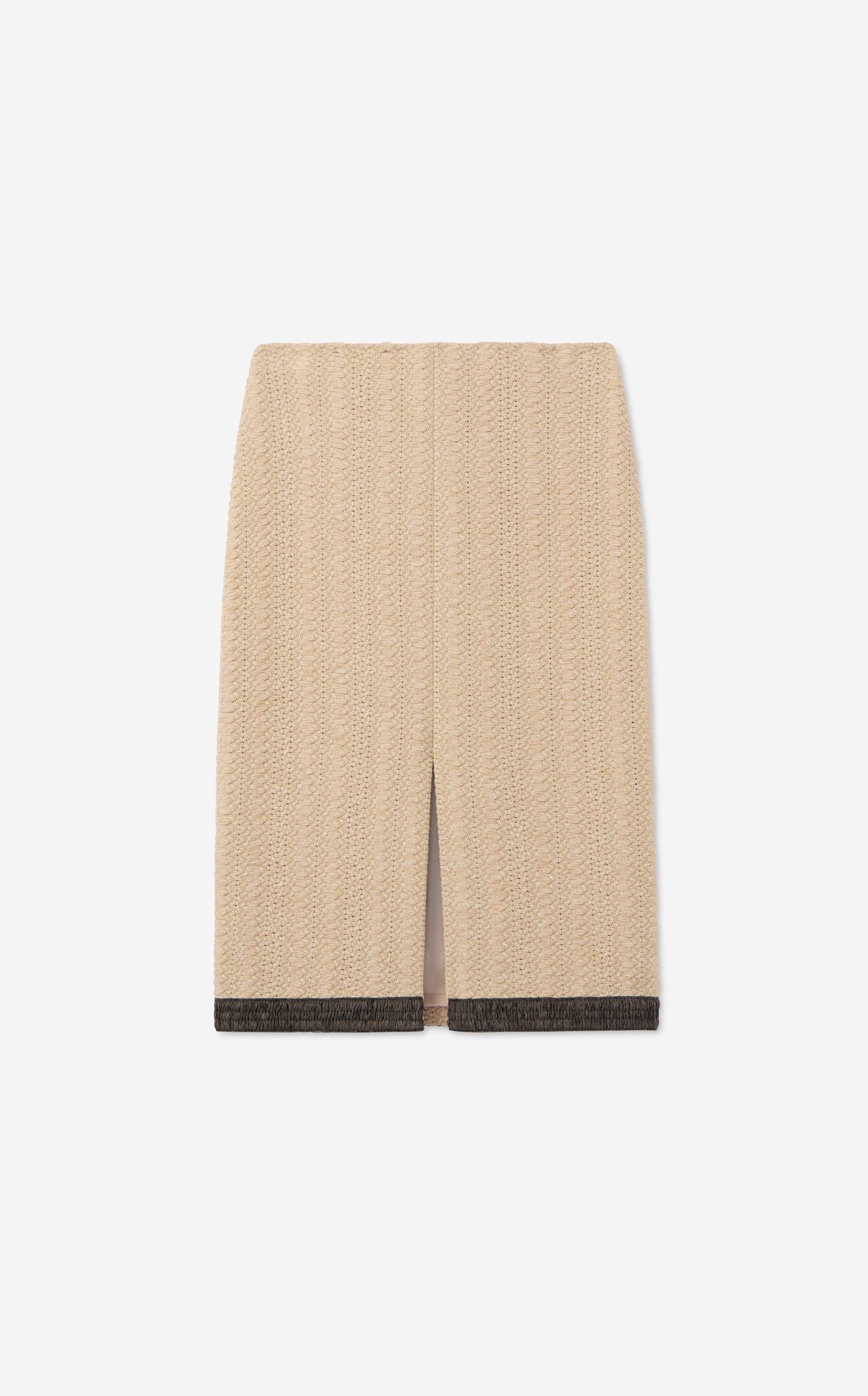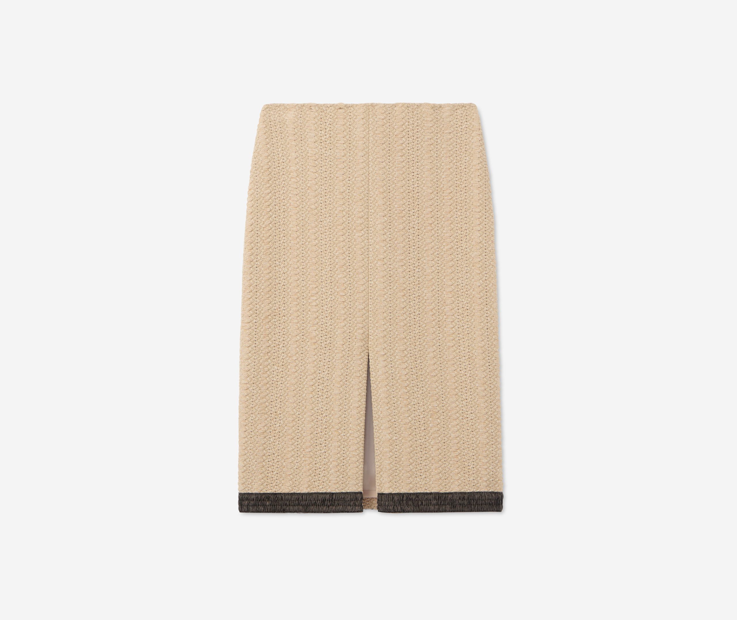 This lined basketweave knit skirt brings beautiful texture to a sleek silhouette in a straight cut, front slit style with a contrast knit hem.All Sales are Final. No Returns or Exchanges.