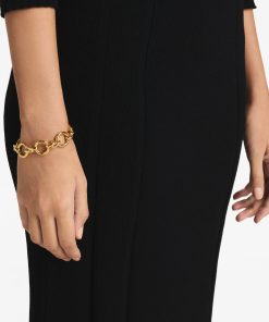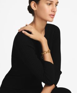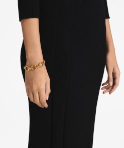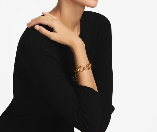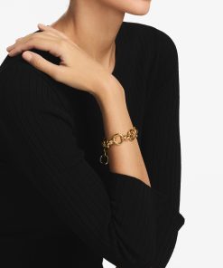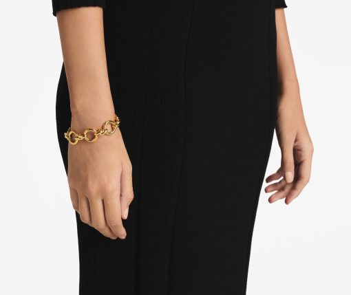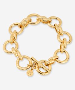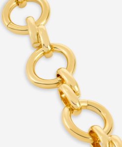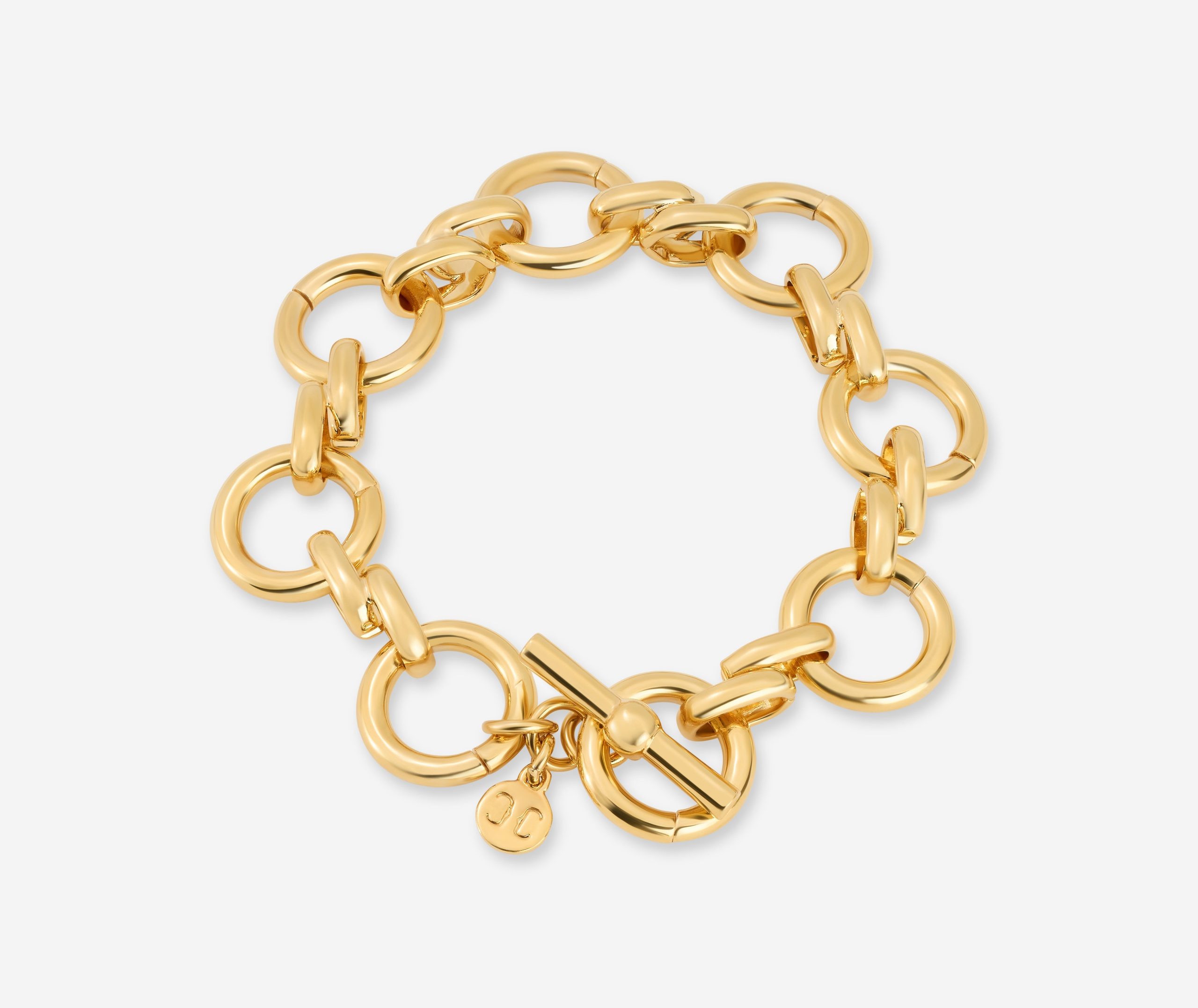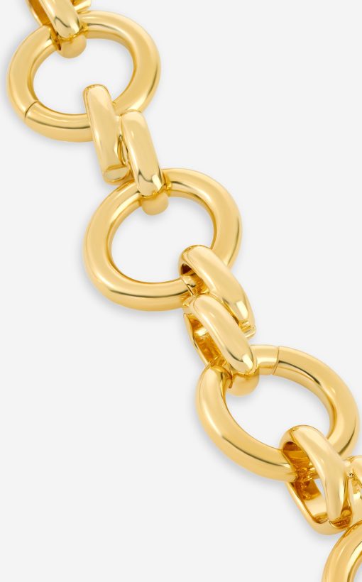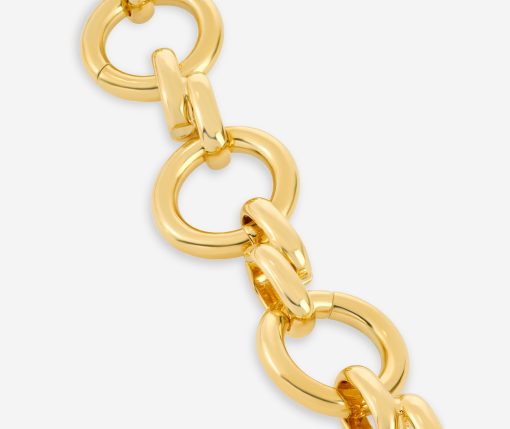 Golden circles form this Italian chain bracelet, as smaller links tie the piece together and meet at a T-bar closure.