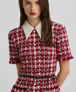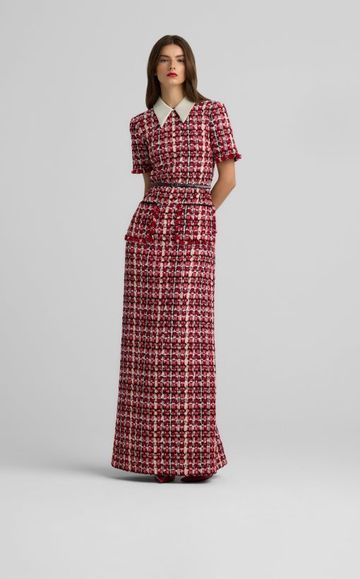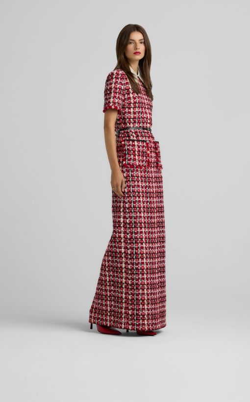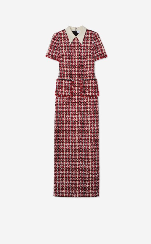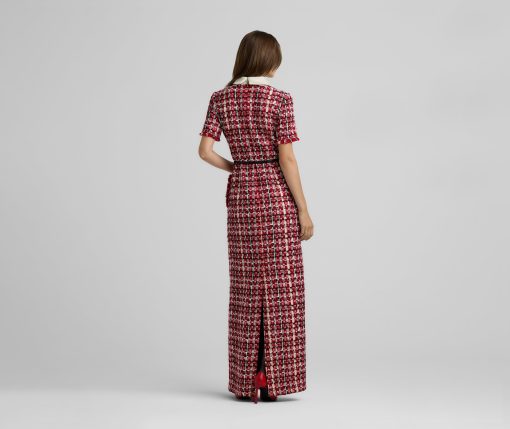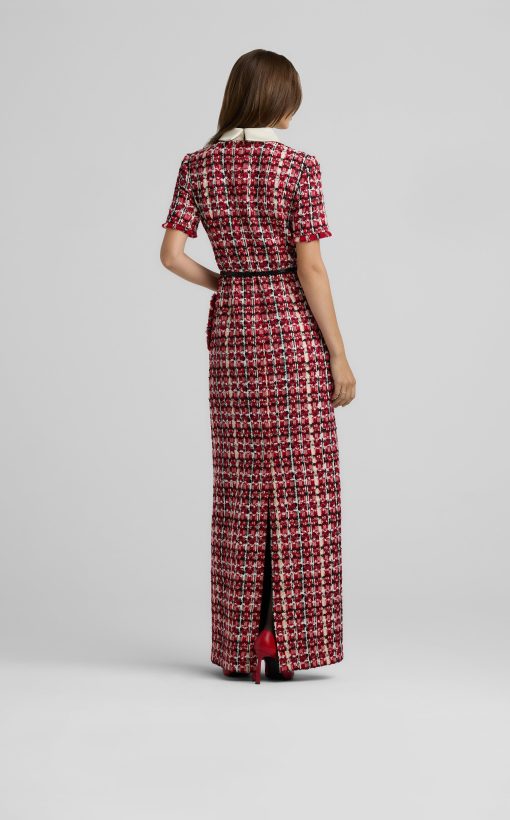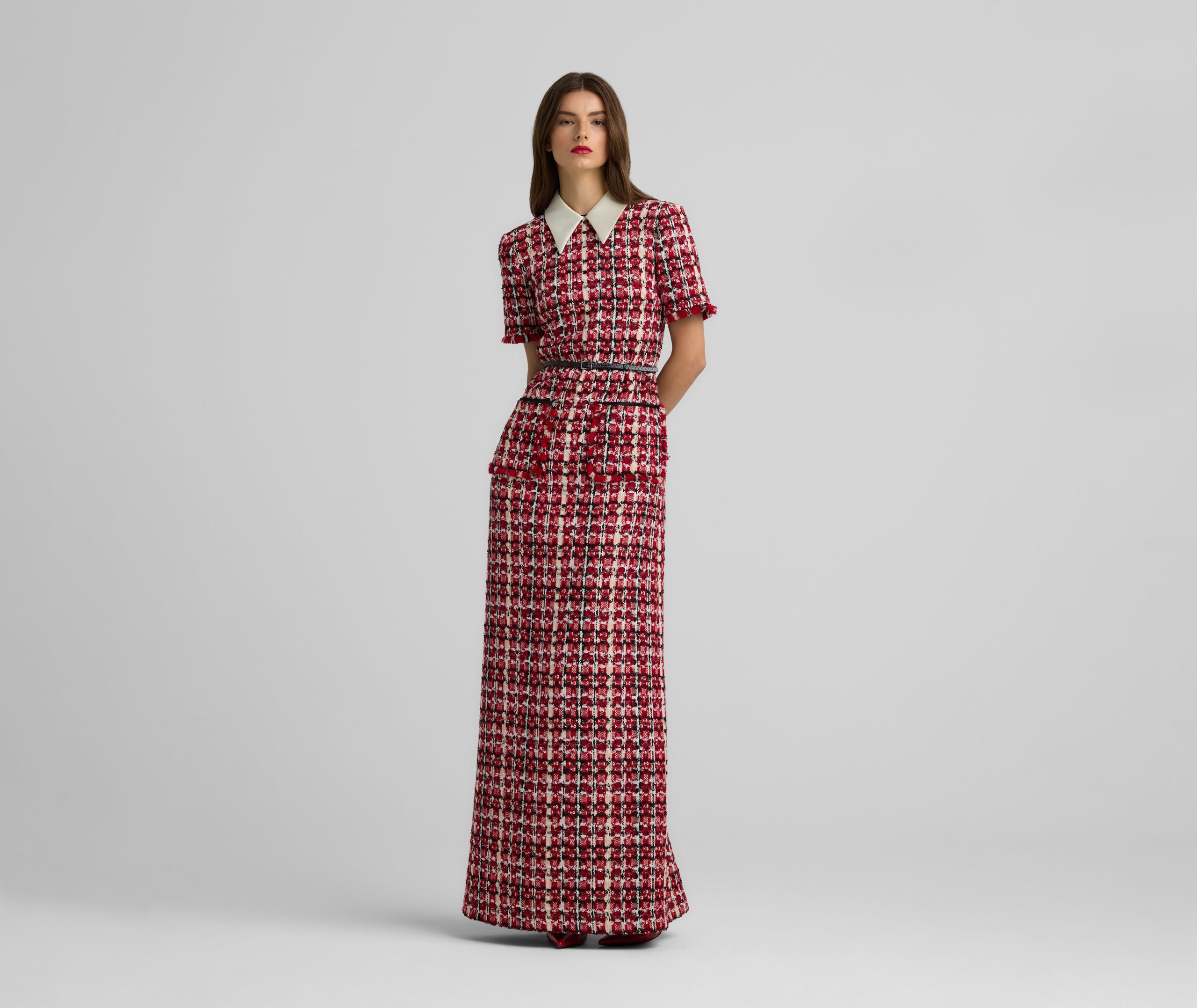 A soft plaid tweed knit dresses up for evening in this unique satin-collared short sleeve gown with patch pockets and a sophisticated straight skirt.All Sales are Final. No Returns or Exchanges.