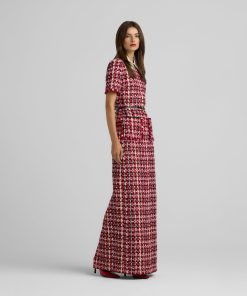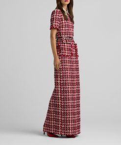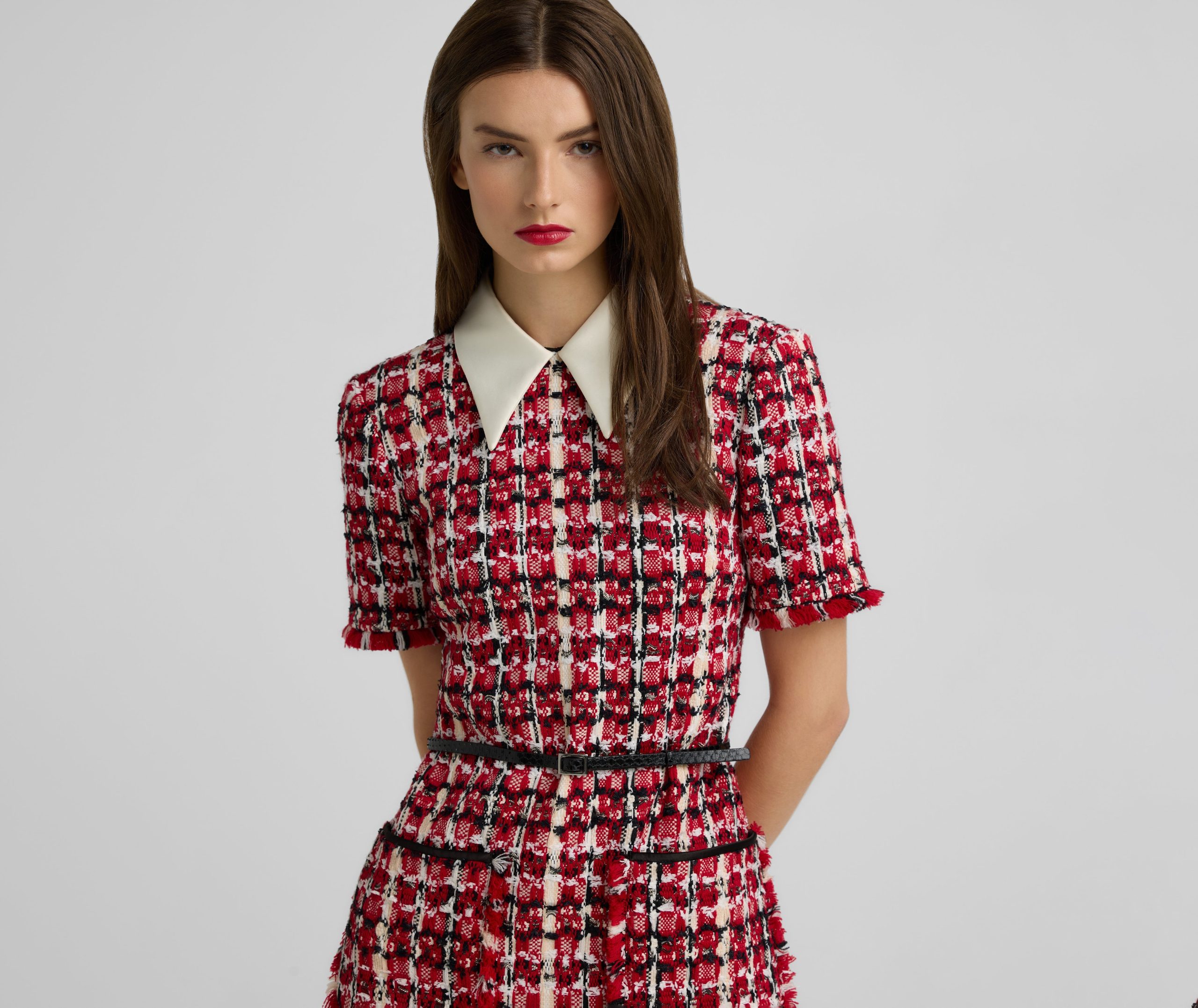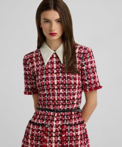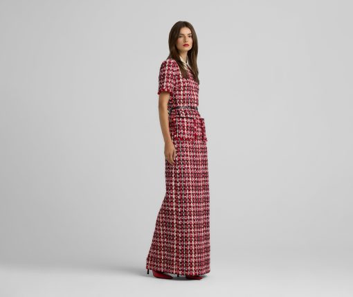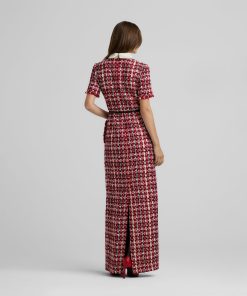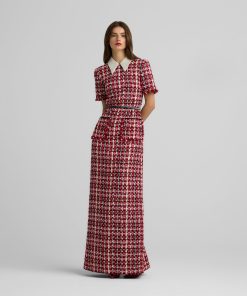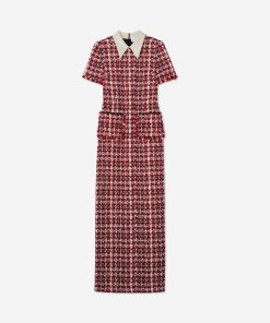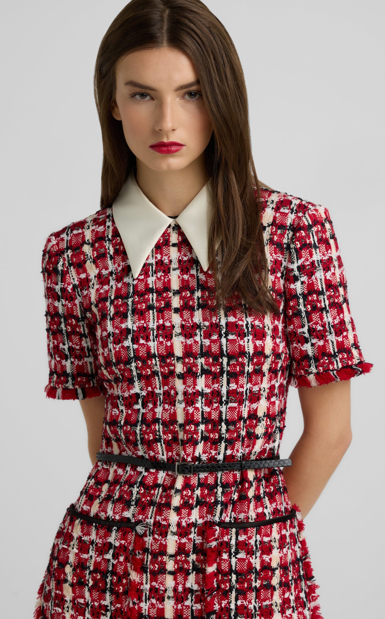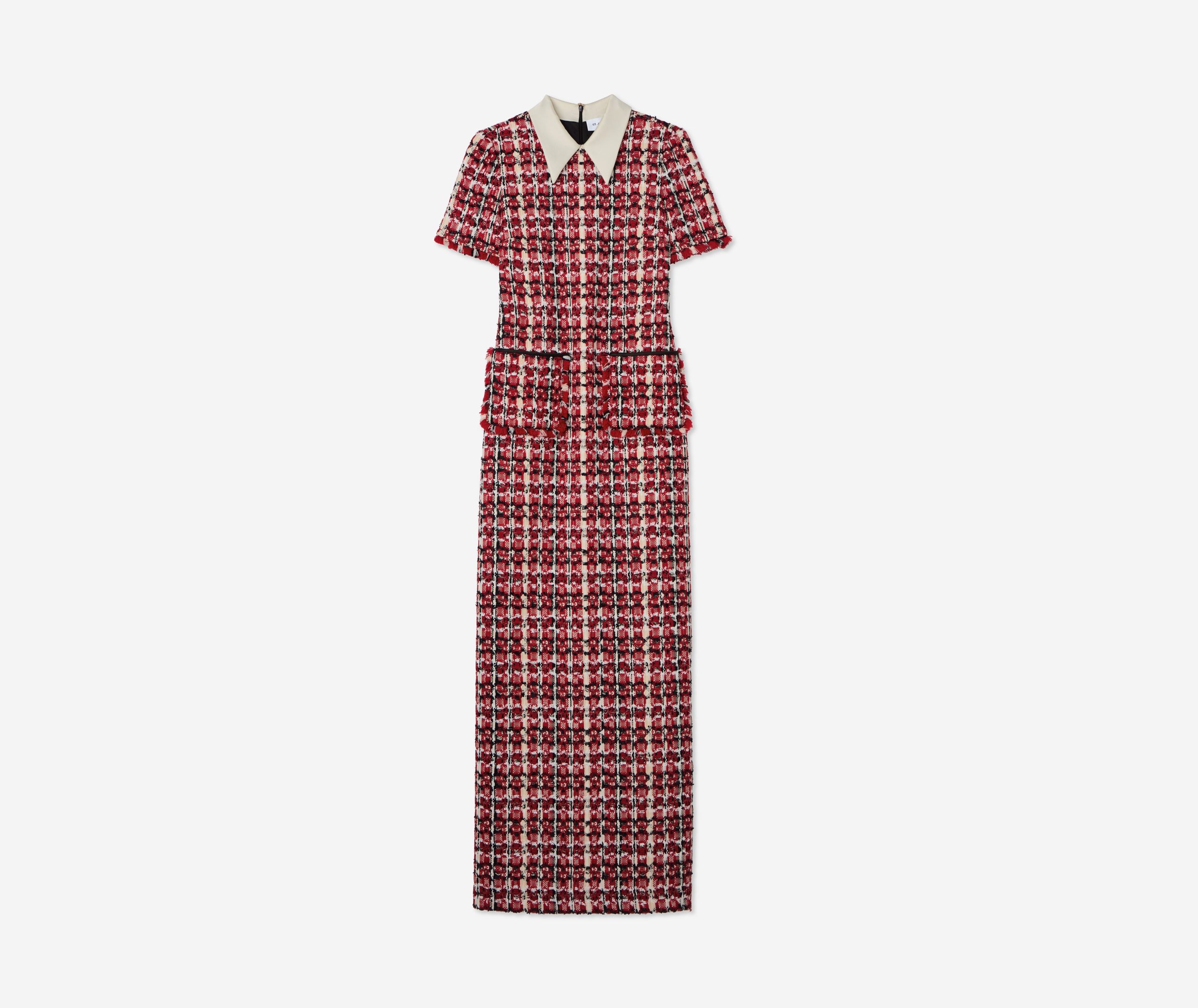 A soft plaid tweed knit dresses up for evening in this unique satin-collared short sleeve gown with patch pockets and a sophisticated straight skirt.All Sales are Final. No Returns or Exchanges.