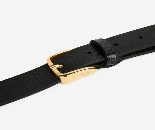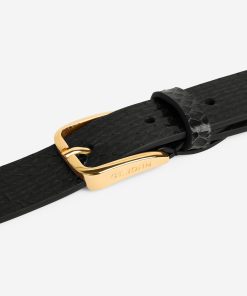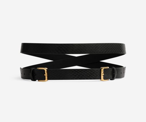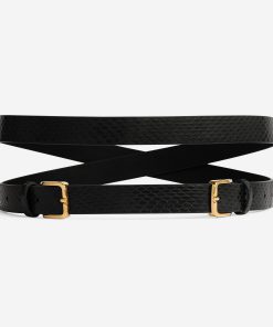 This black leather belt wraps twice around the waist, finishing with double buckles in gold hardware for an update on a classic accessory.
