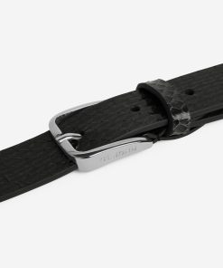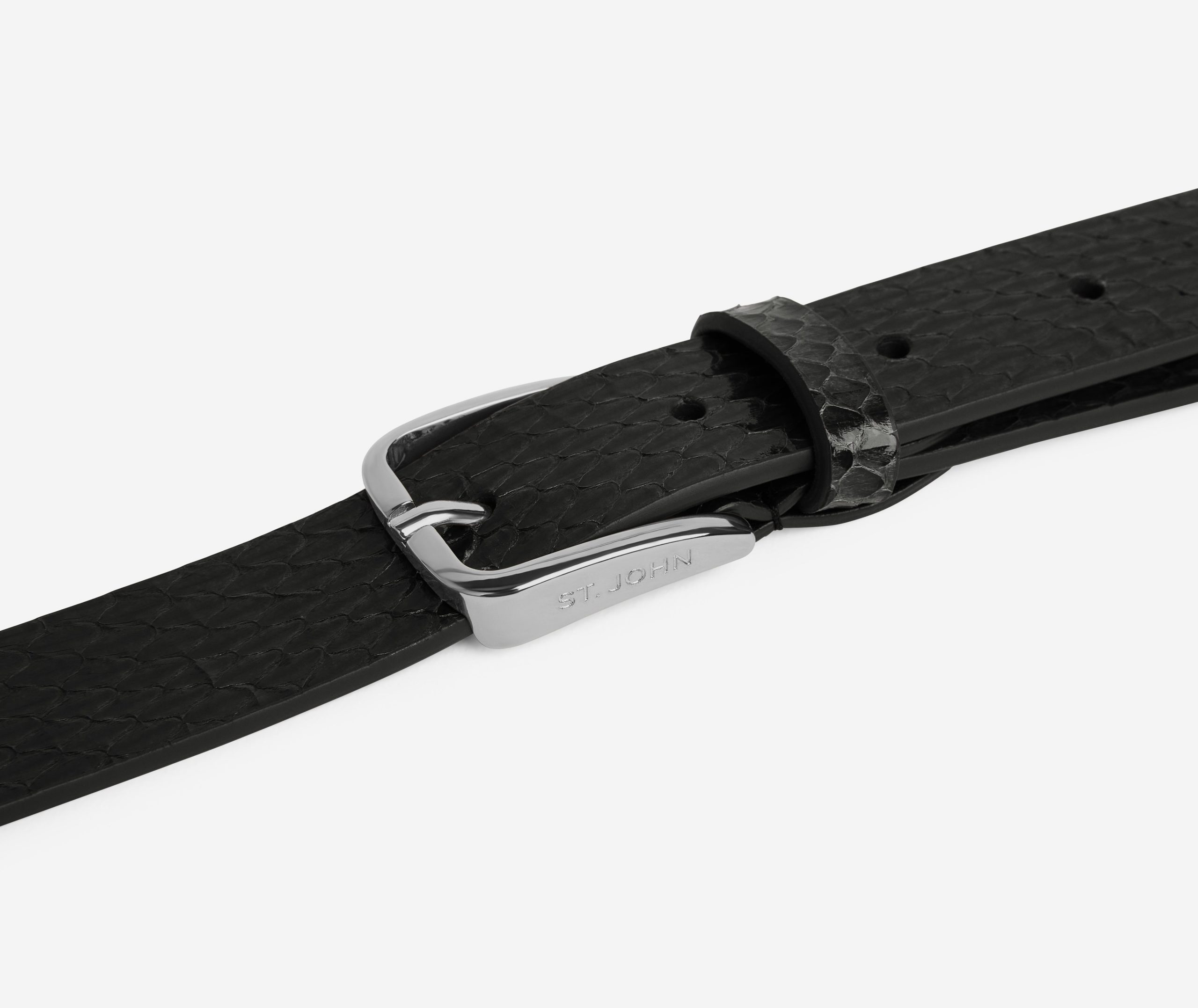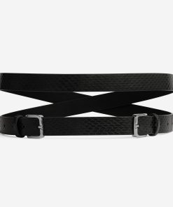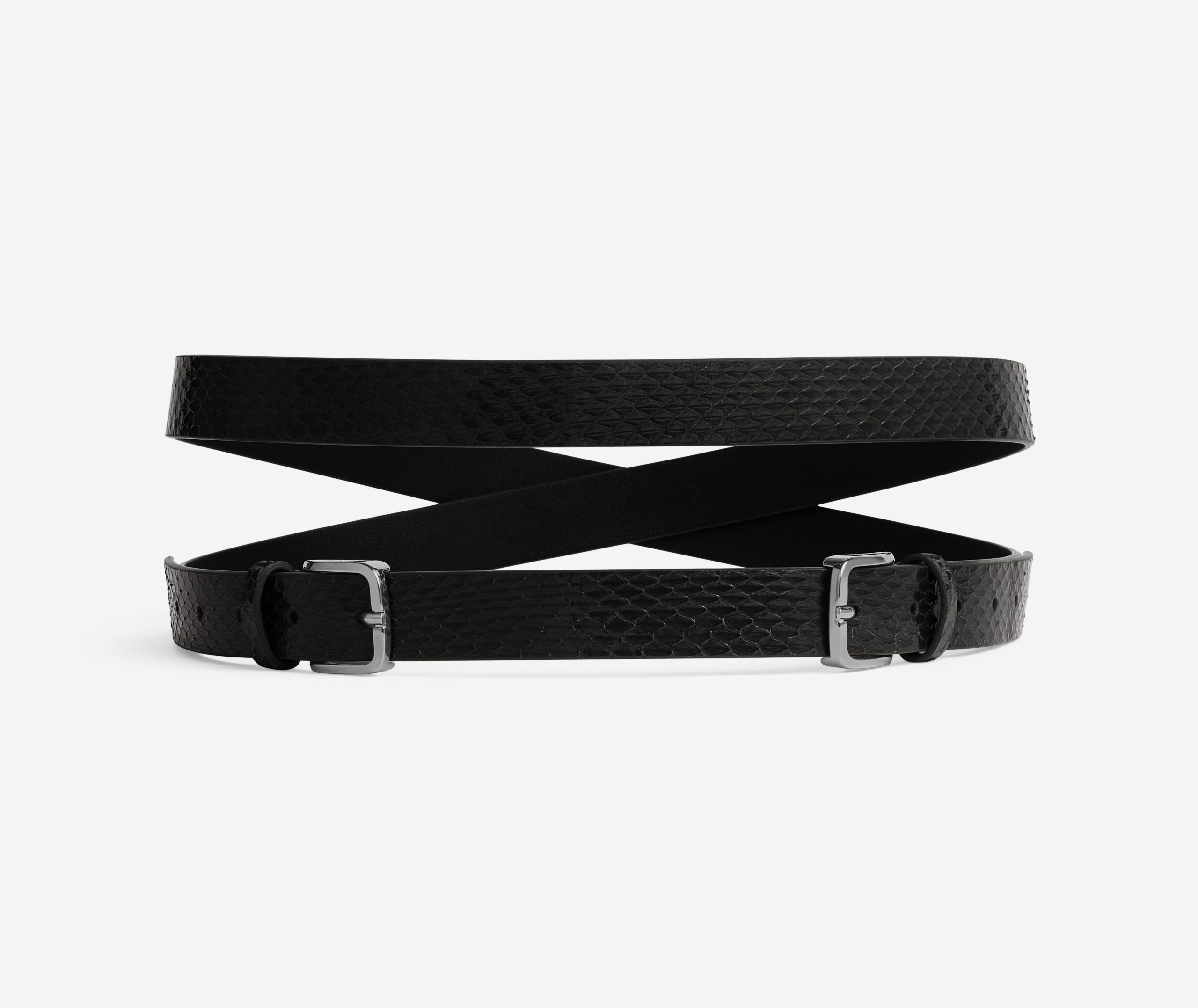 This black leather belt wraps twice around the waist, finishing with double buckles in gunmetal hardware for an update on a classic accessory.