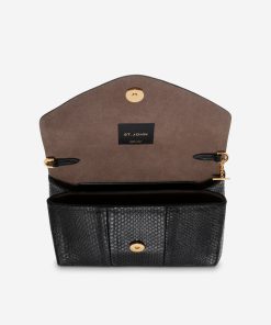 A textured black snakeskin handbag is chic for day or night. Featuring signature St. John loop hardware, leather and chain straps.