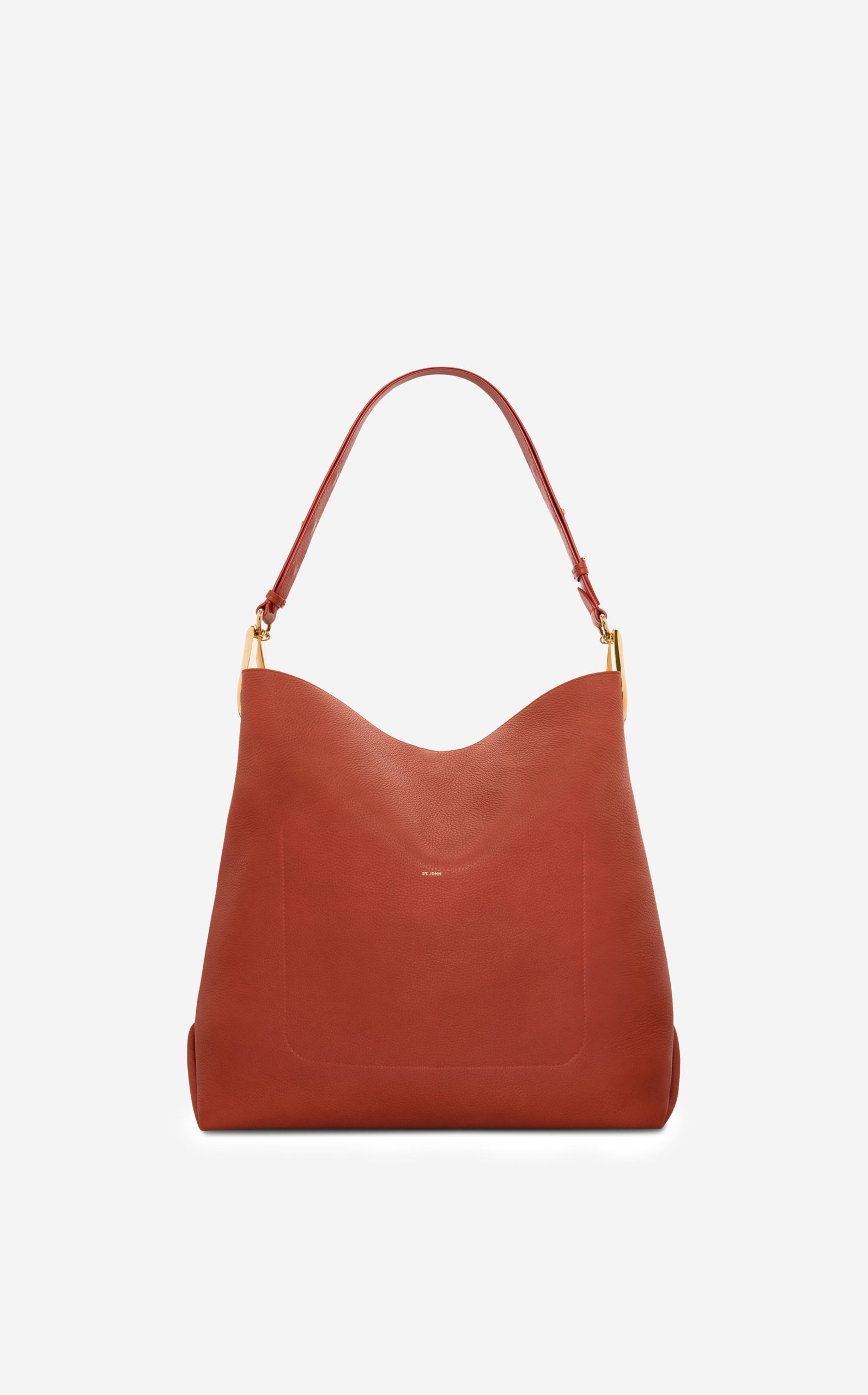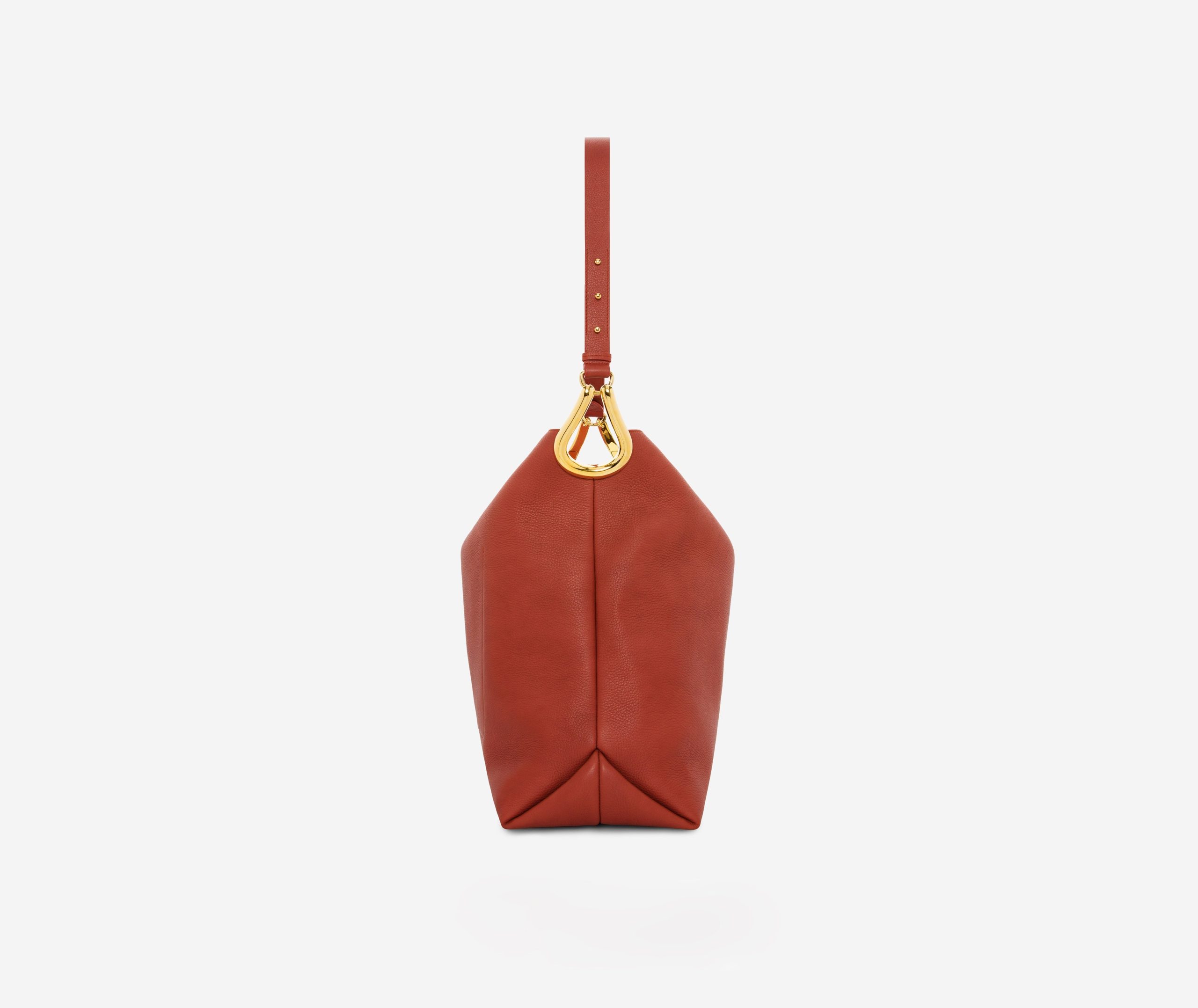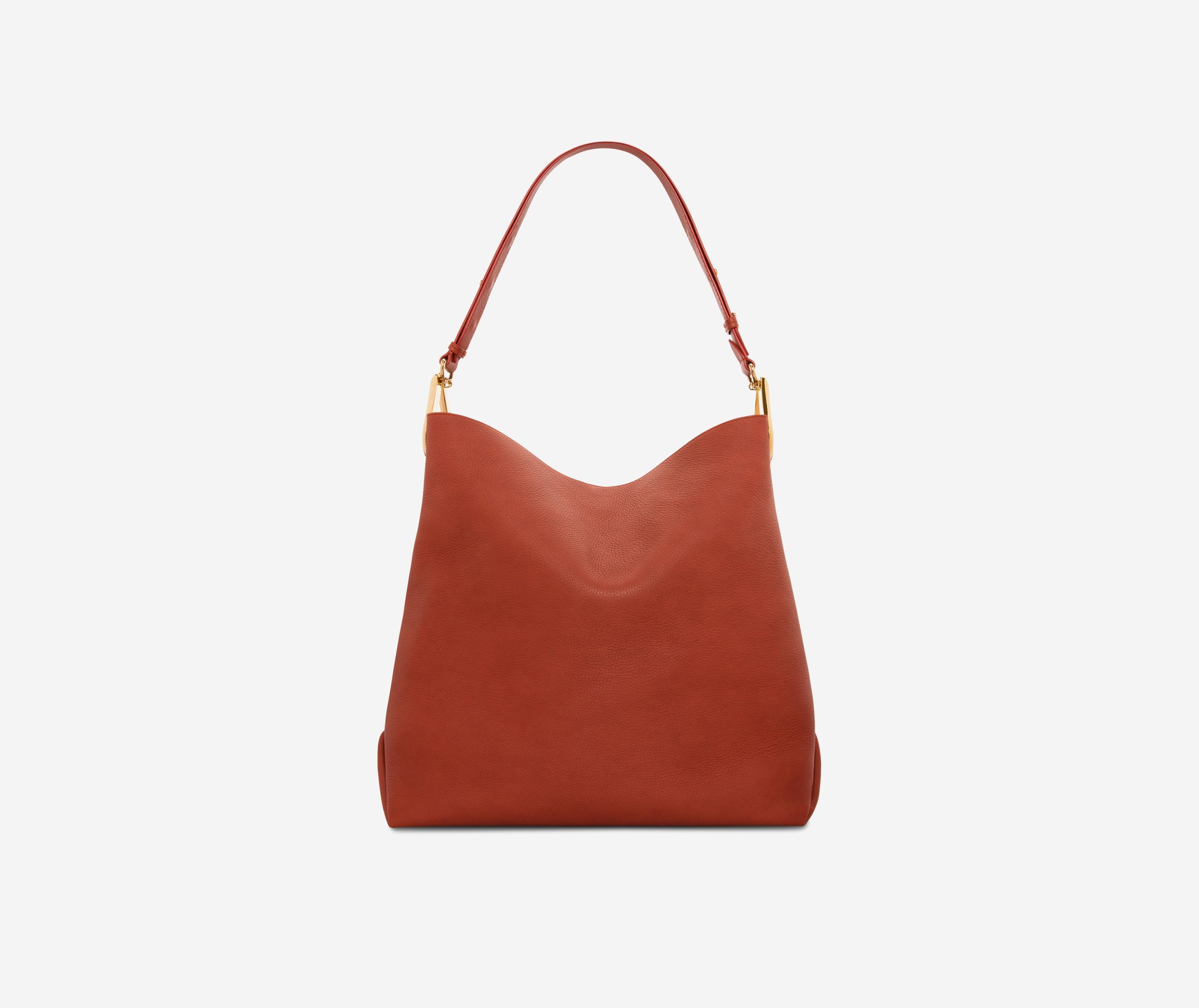 Leather hobo bag in grainy leather with notched top handle, signature loop design at sides, gold-tone accents, and interior side pocket. Modern, versatile and elevated; meet the perfect carryall in a roomy silhouette. Offers complimentary delivery and returns. Delivery and Return Policy