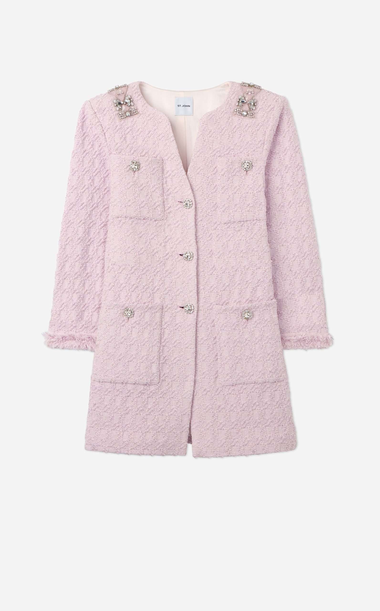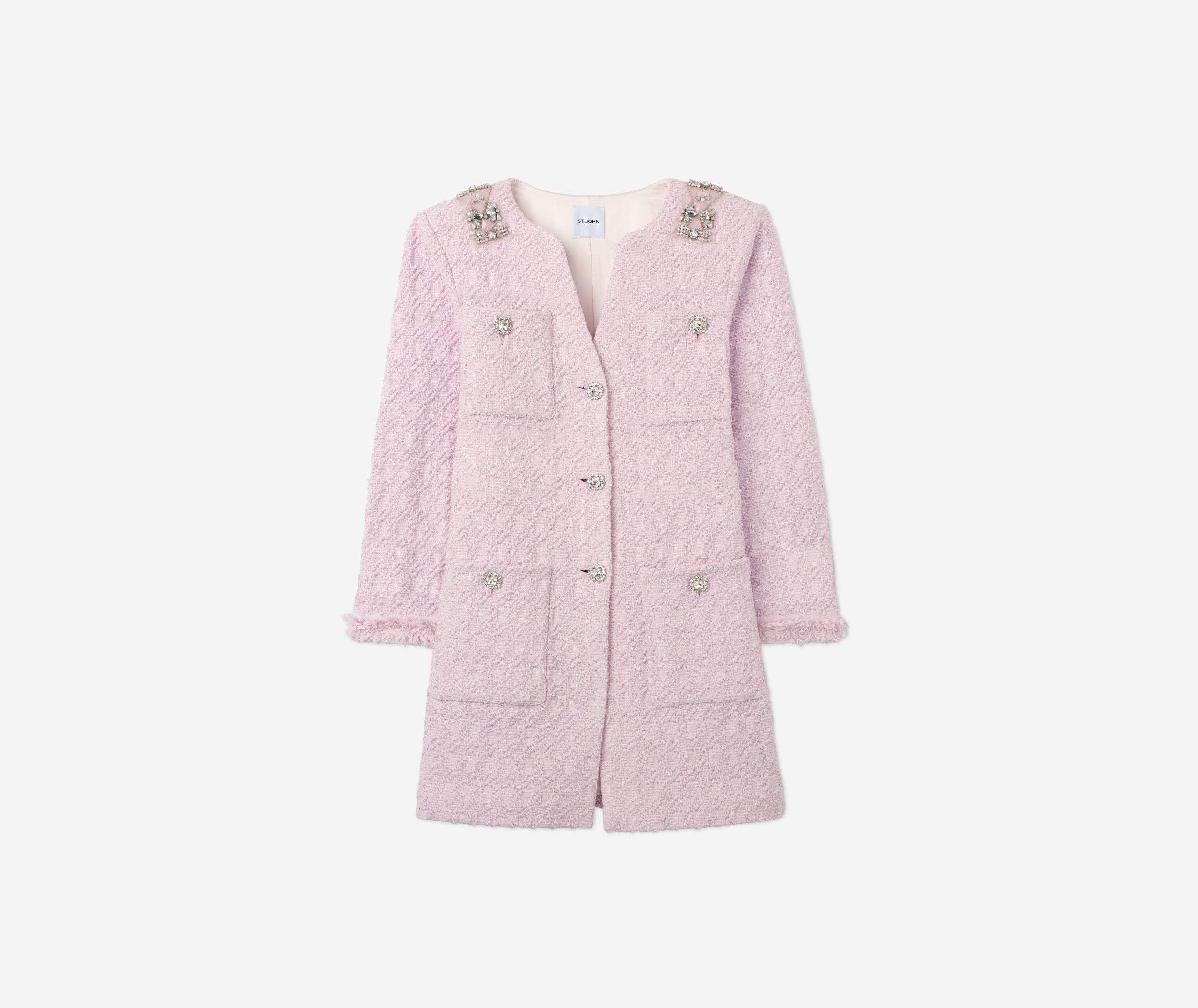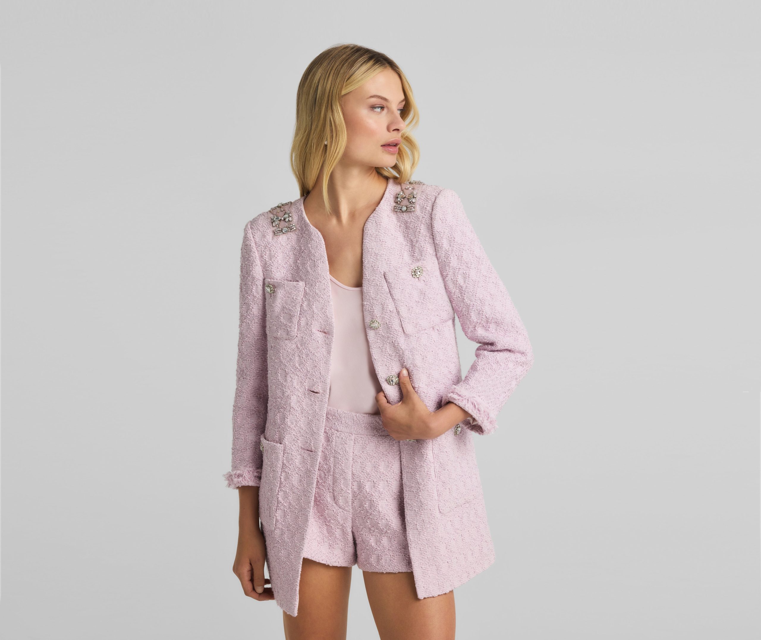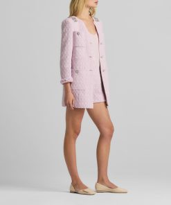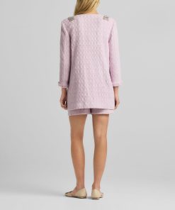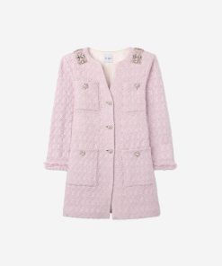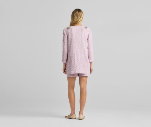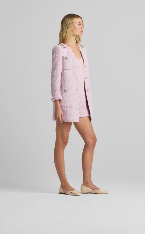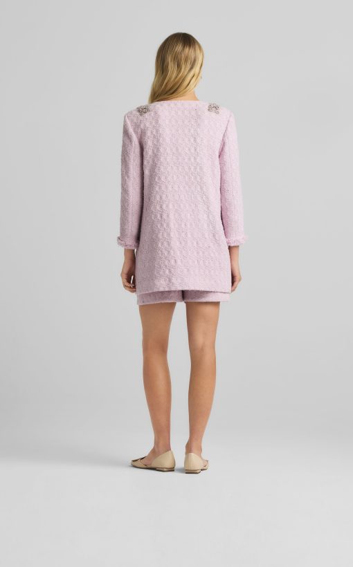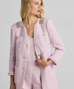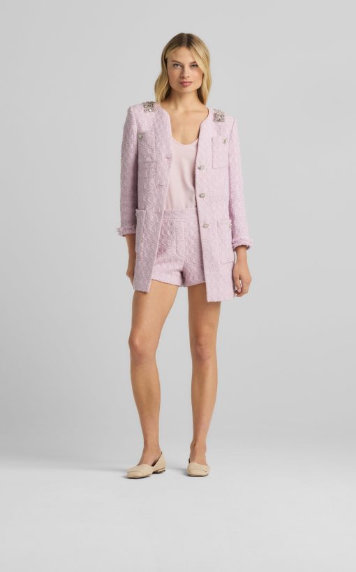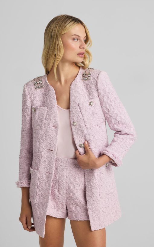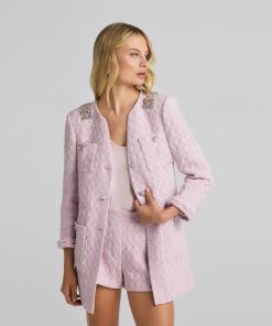 A cotton-blend honeycomb lends soft texture to this round neck jacket, while embellishments at the collar showcase sparkle.All Sales are Final. No Returns or Exchanges.
