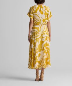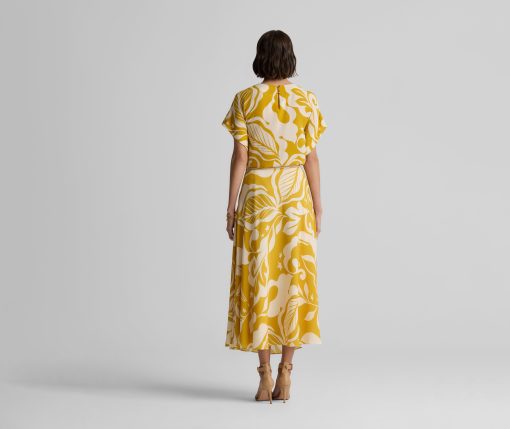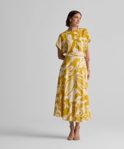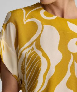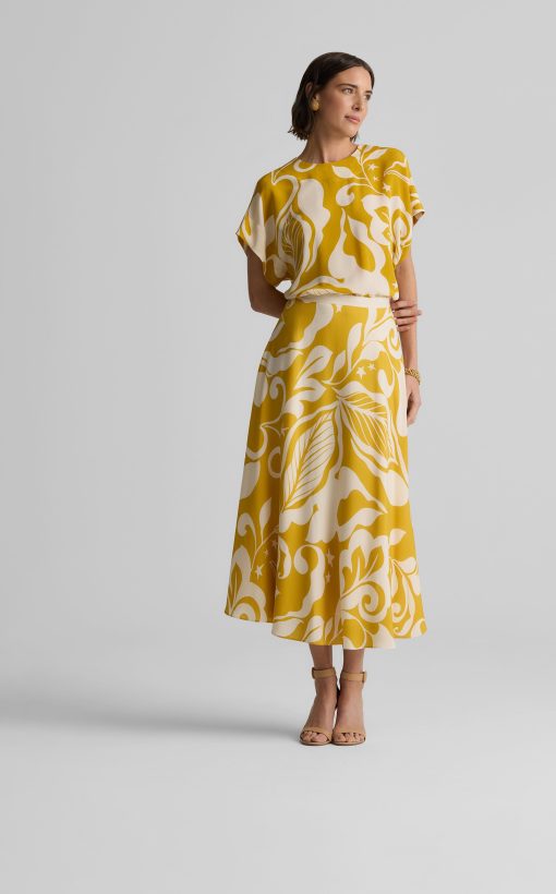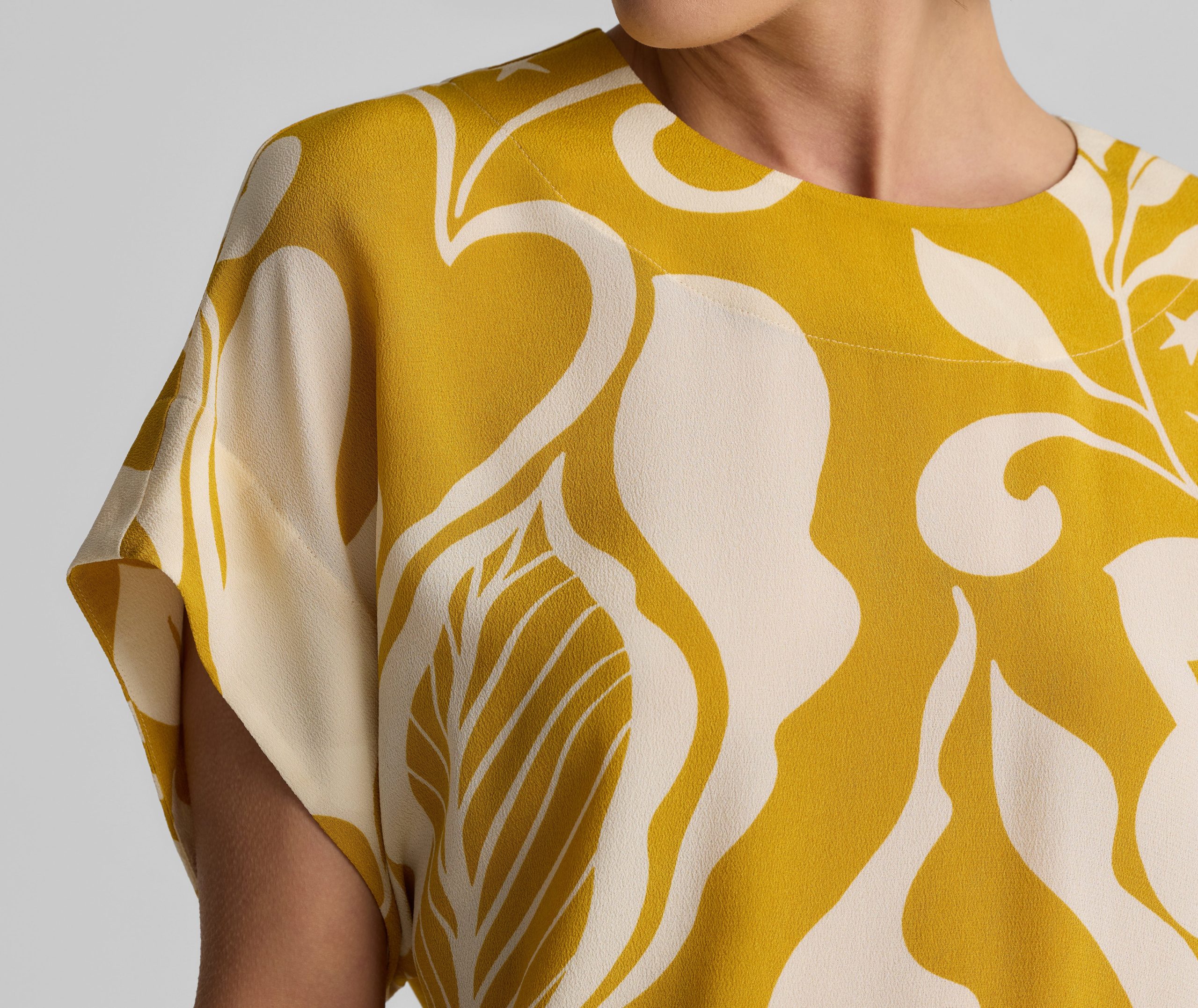 Defined by its graphic leaf print and relaxed dolman t-shirt sleeves, the Joan in brilliant Ecru and Goldenrod makes a splashy addition to your everyday wardrobe and dressy attire alike. Pair this airy top with the Eden Skirt for a bold, coordinated set or mix-and-match with solid separates to for a more subtle pop of pattern.
