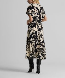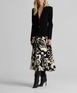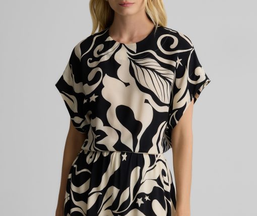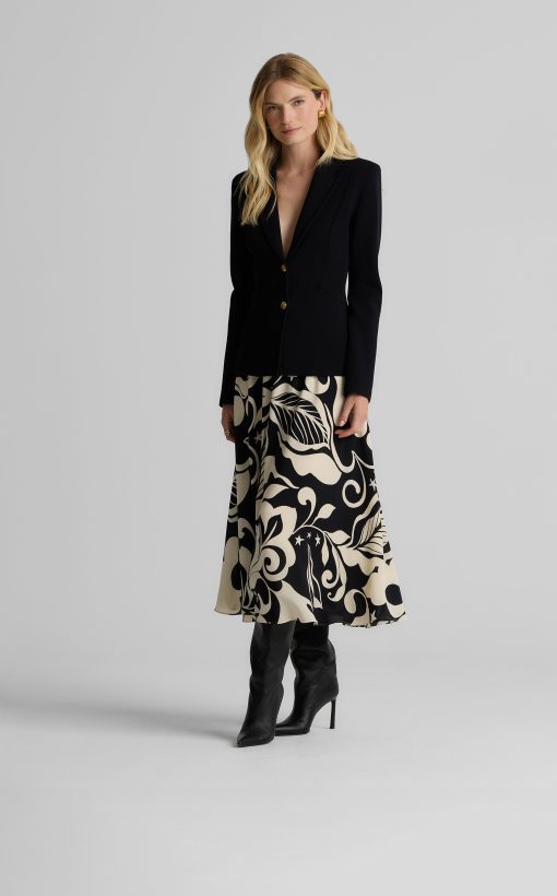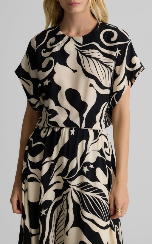 Defined by its graphic leaf print and relaxed dolman t-shirt sleeves, the Joan in classic Ecru and Black makes a splashy addition to your everyday wardrobe and dressy attire alike. Pair this airy top with the Eden Skirt for a bold, coordinated set or mix-and-match with solid separates to for a more subtle pop of pattern.
