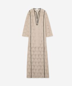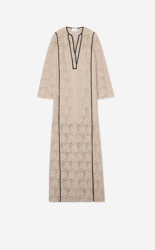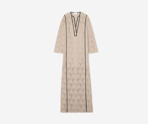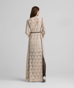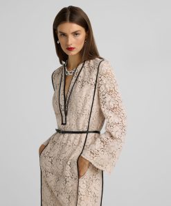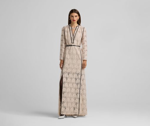 Lace takes a modern turn in cotton-blend guipure, in a long sleeve gown with contrast piping, slits, and a V-neck that bring personality to the piece.All Sales are Final. No Returns or Exchanges.