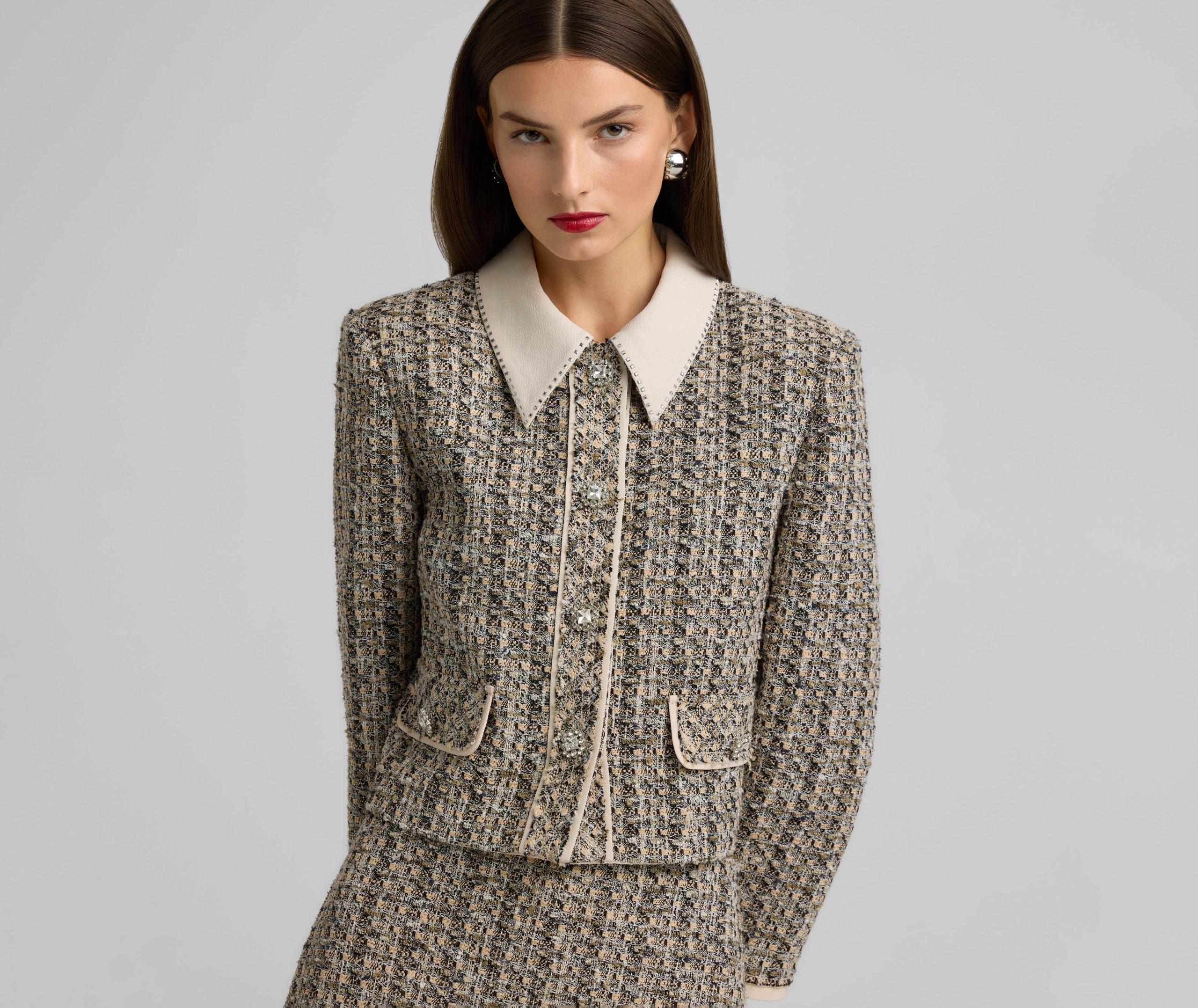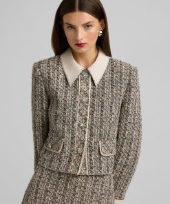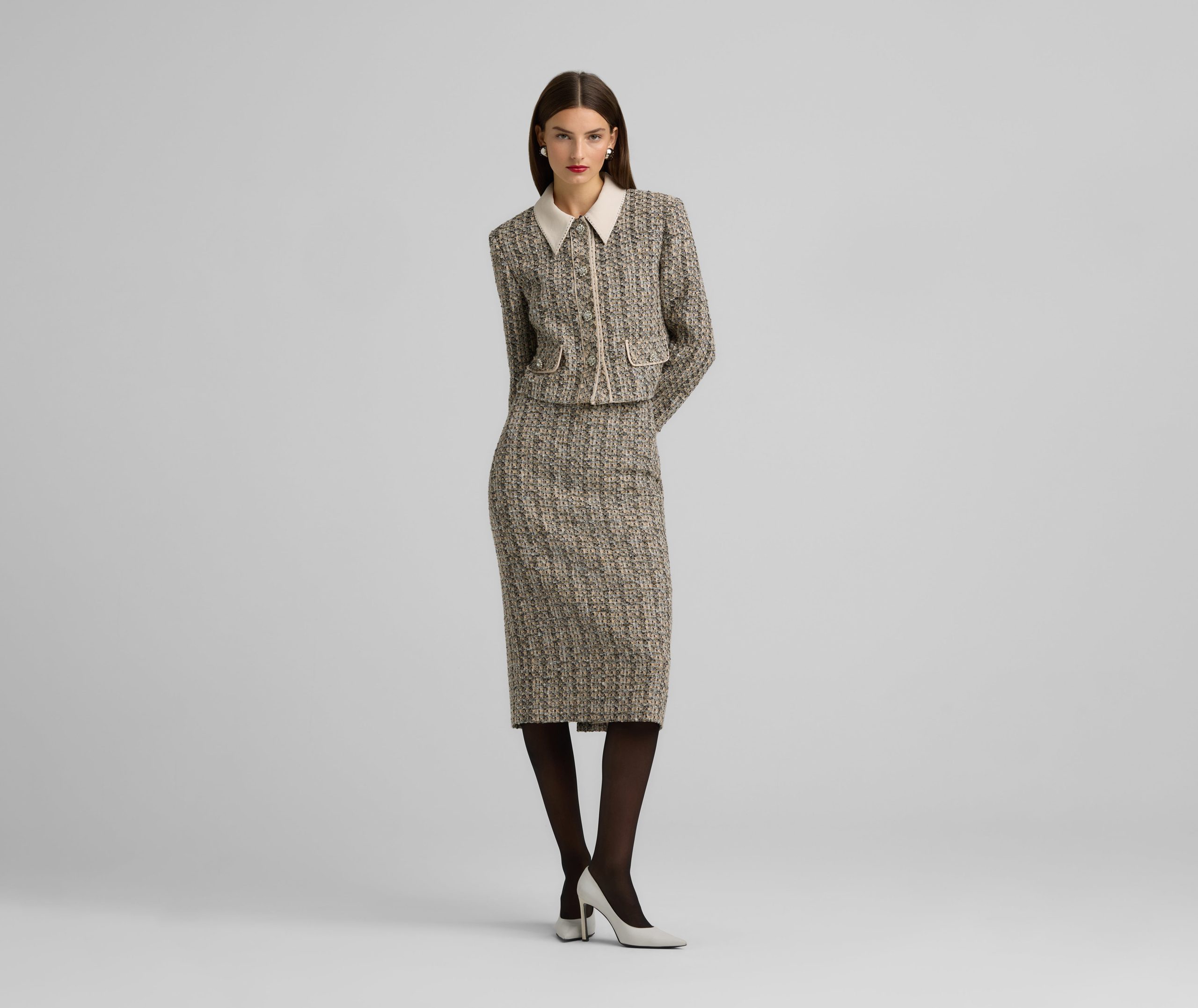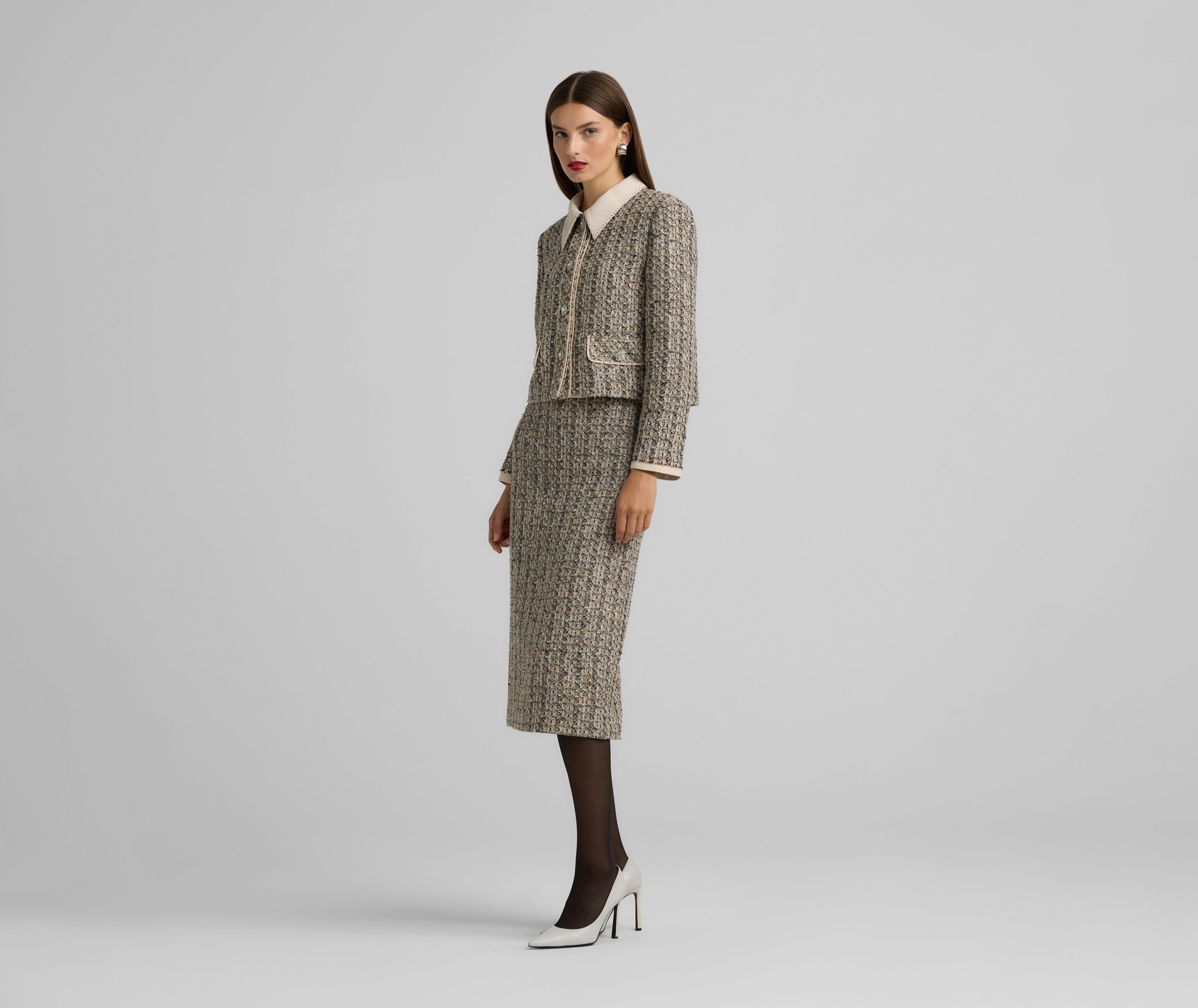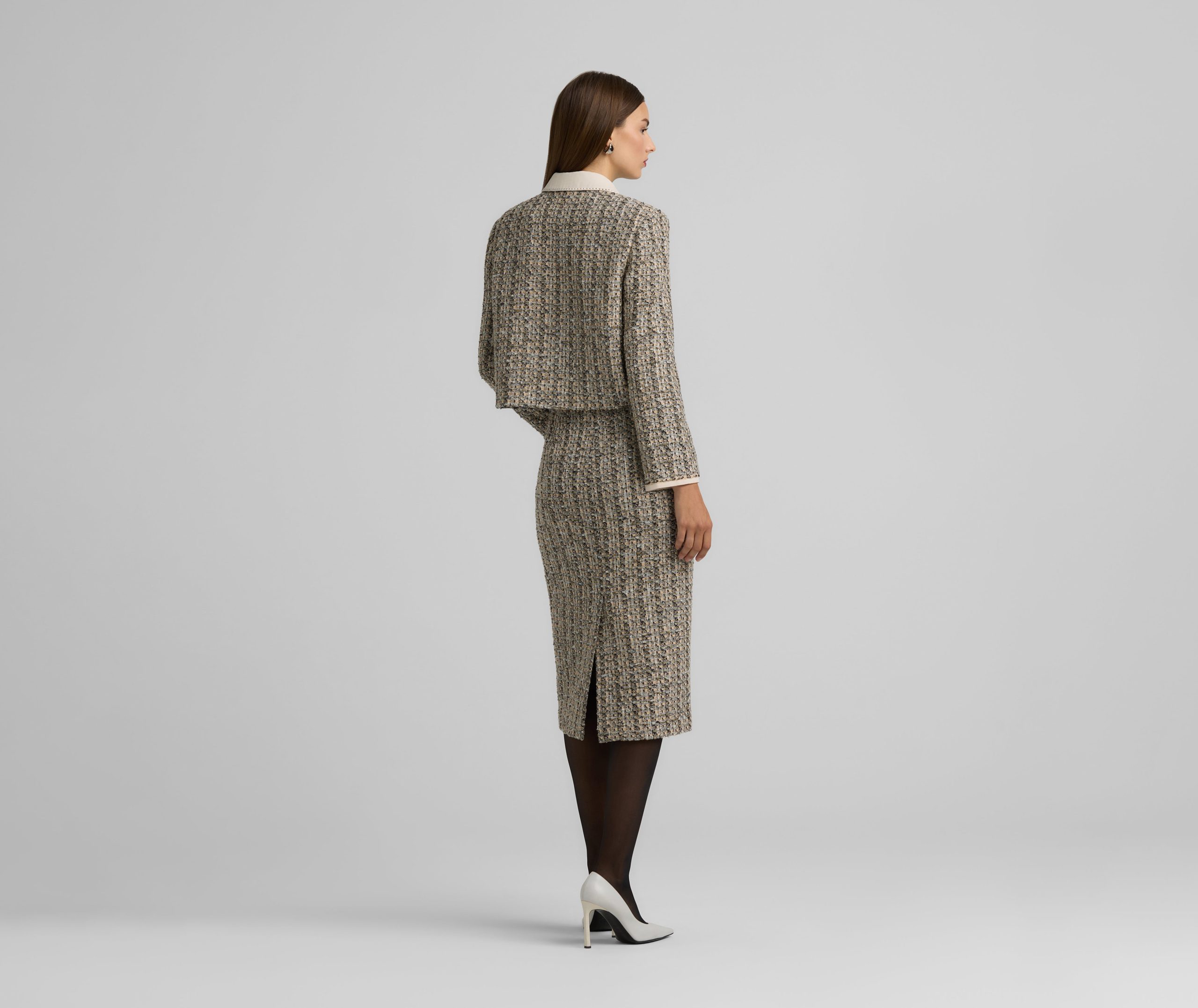 Metallic tweed collage knit brings texture to a pencil skirt, while a back slit offers ease of movement in this slim-cut style.All Sales are Final. No Returns or Exchanges.