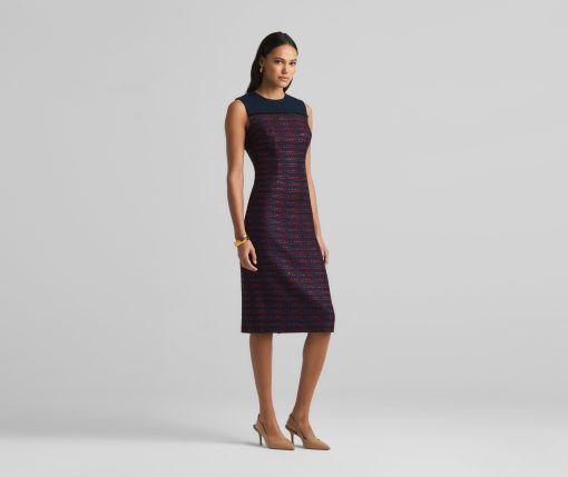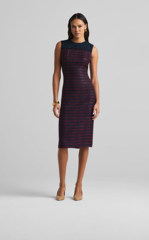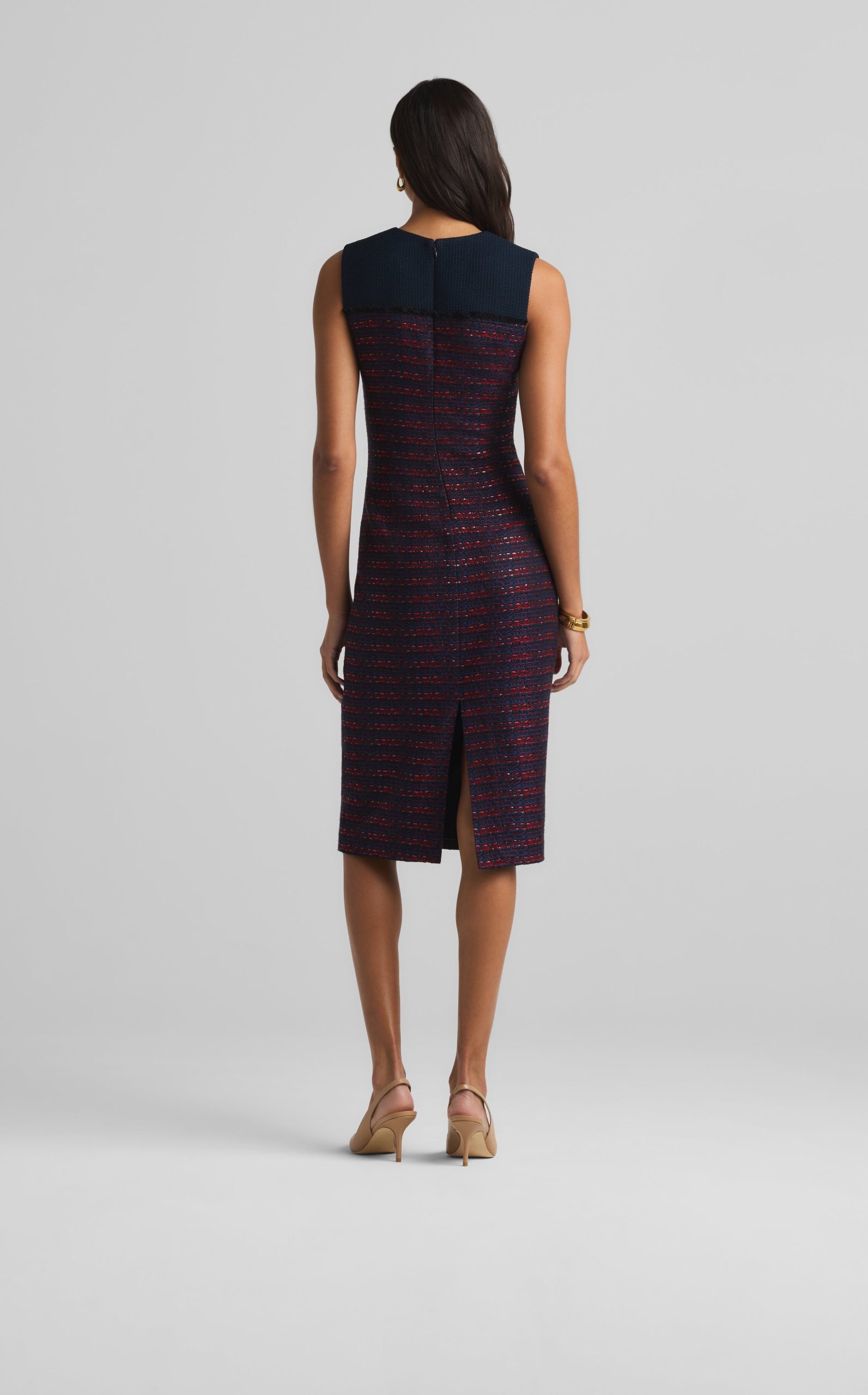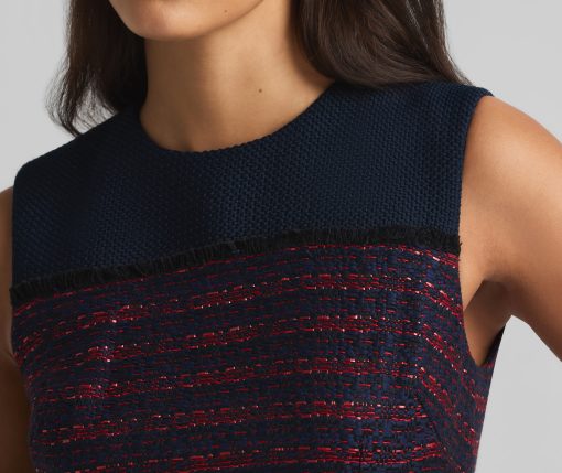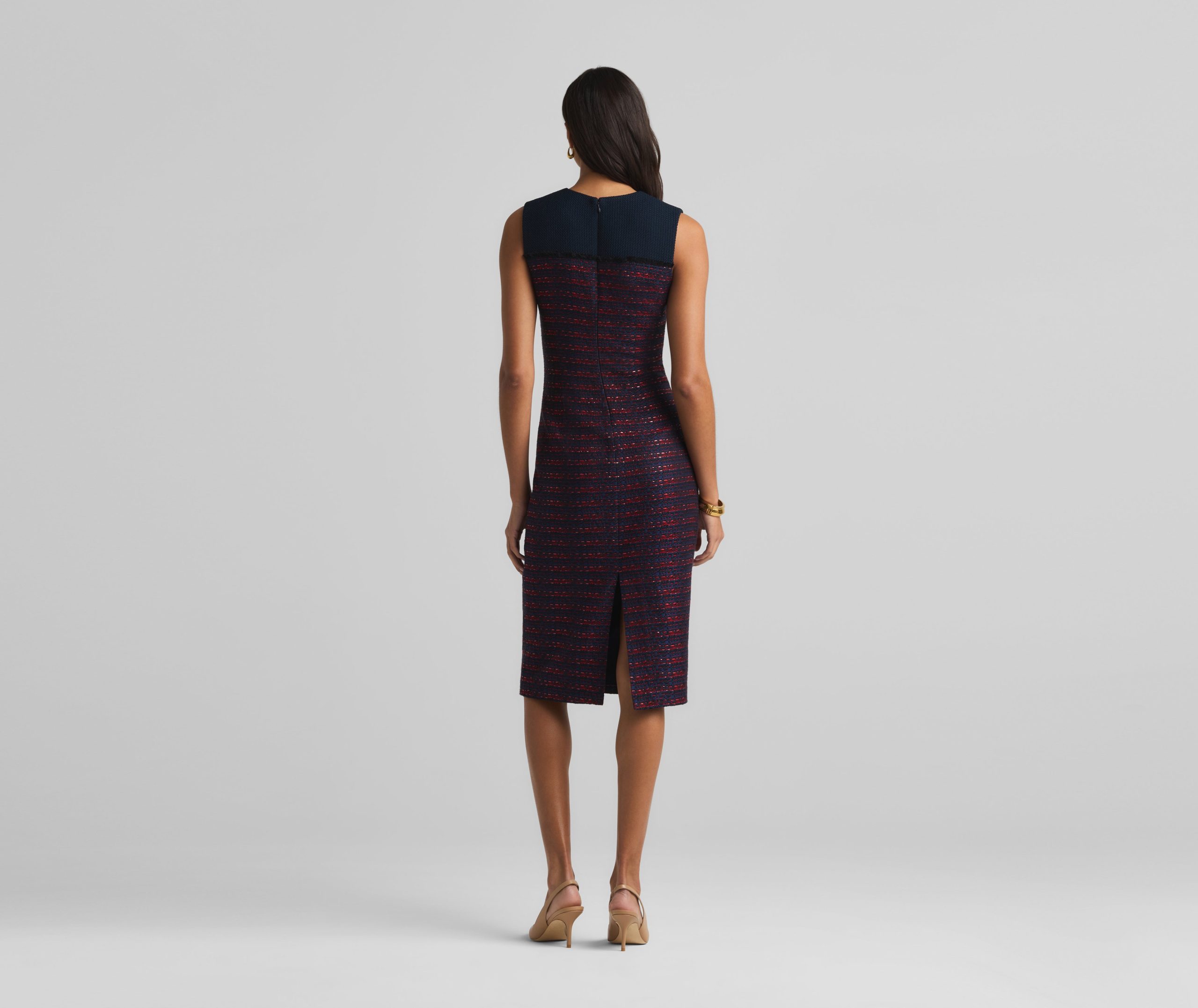A textured tweed is cut for a close fit, while a solid knit panel tops the sleeveless dress. A look as perfect for the office as it is out.All Sales are Final. No Returns or Exchanges.
