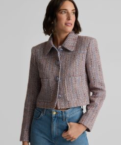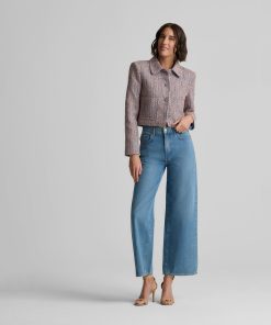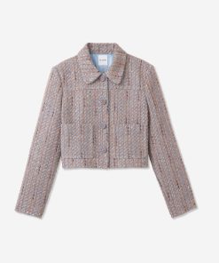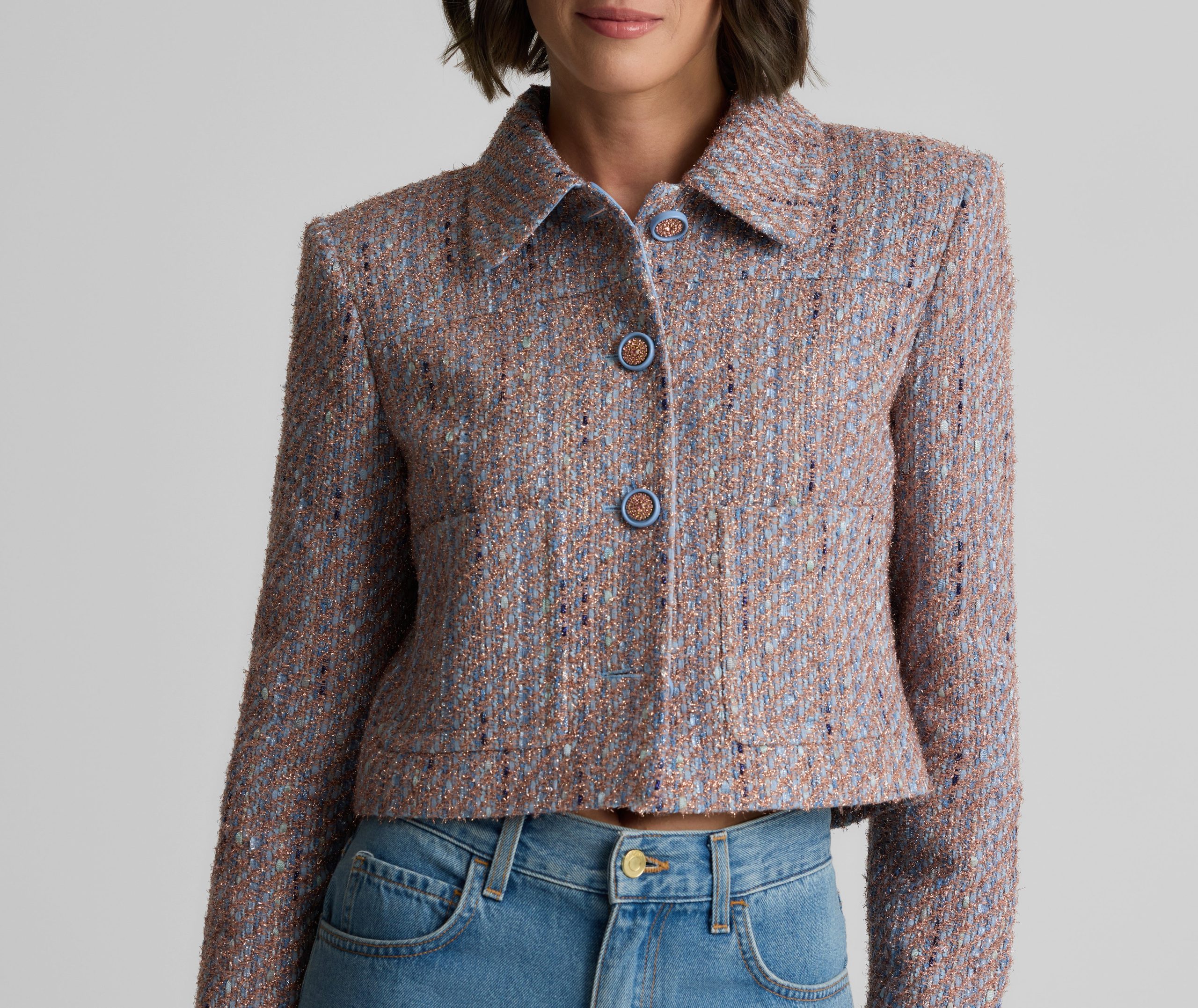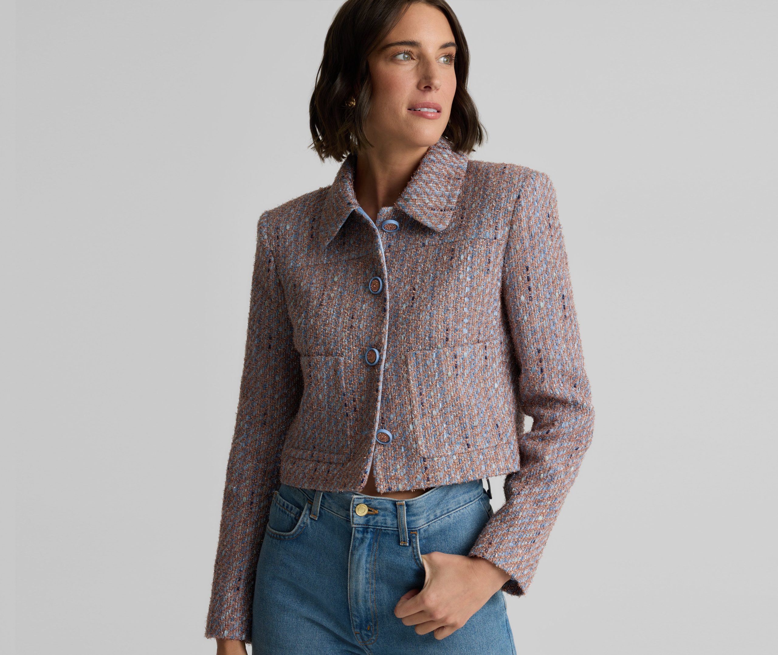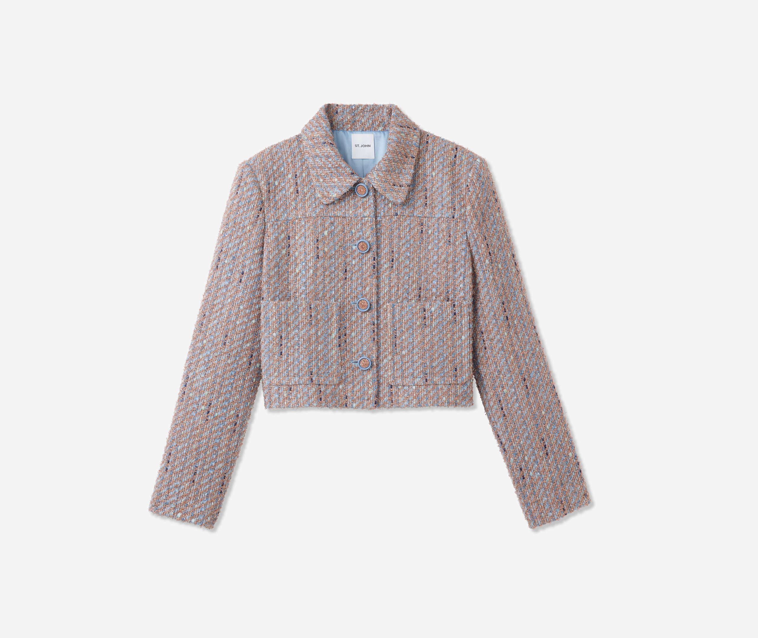 With its smart, sophisticated silhouette, this tweed jacket makes an elegant addition to any modern woman’s wardrobe, while its bejeweled buttons and subtly sparkling finish add a dose of dazzle that takes it easily into the evening.