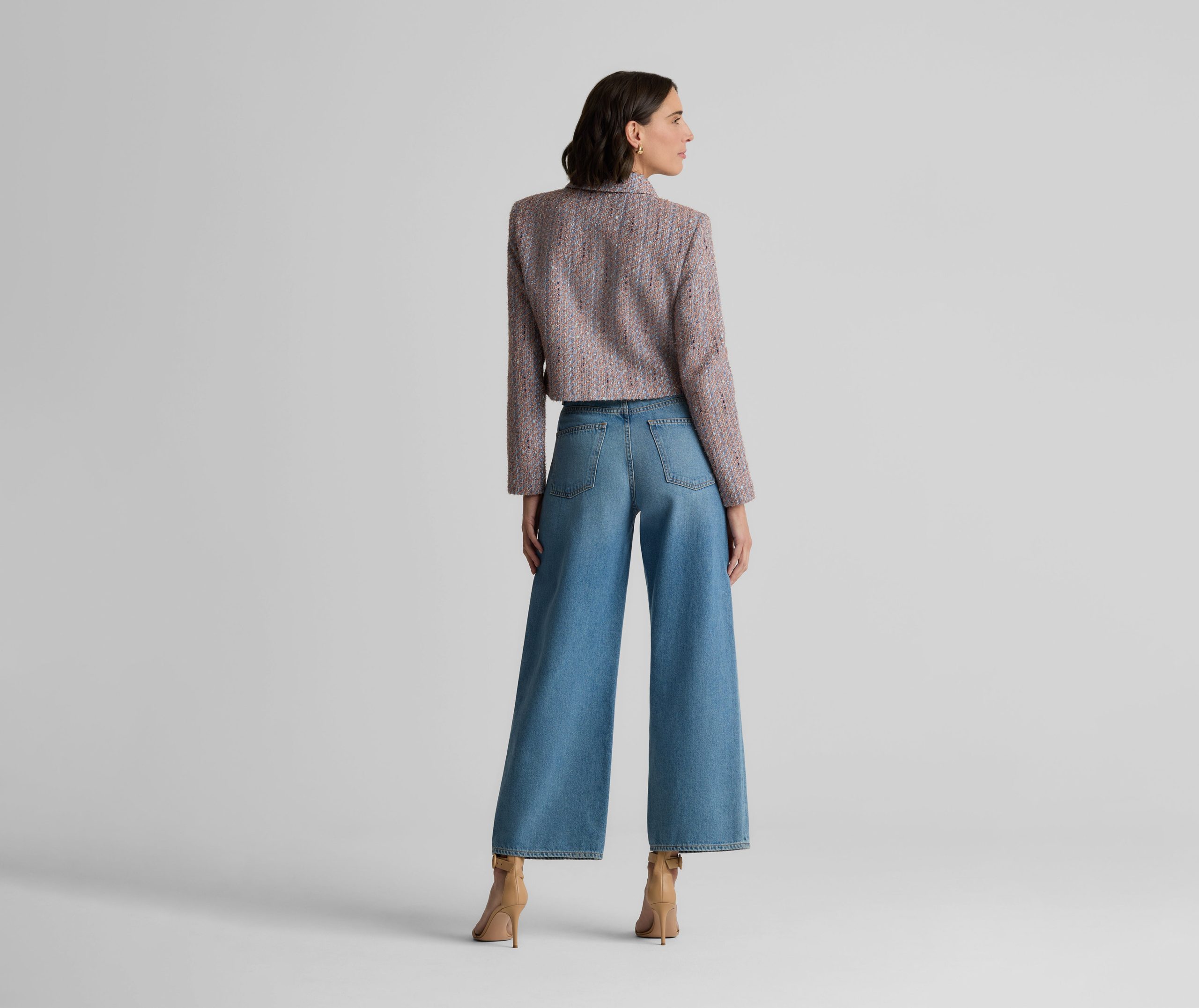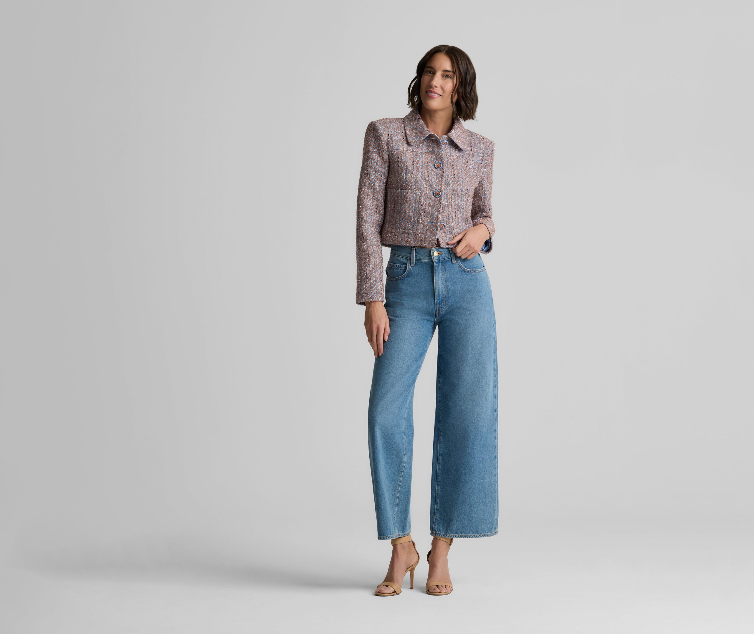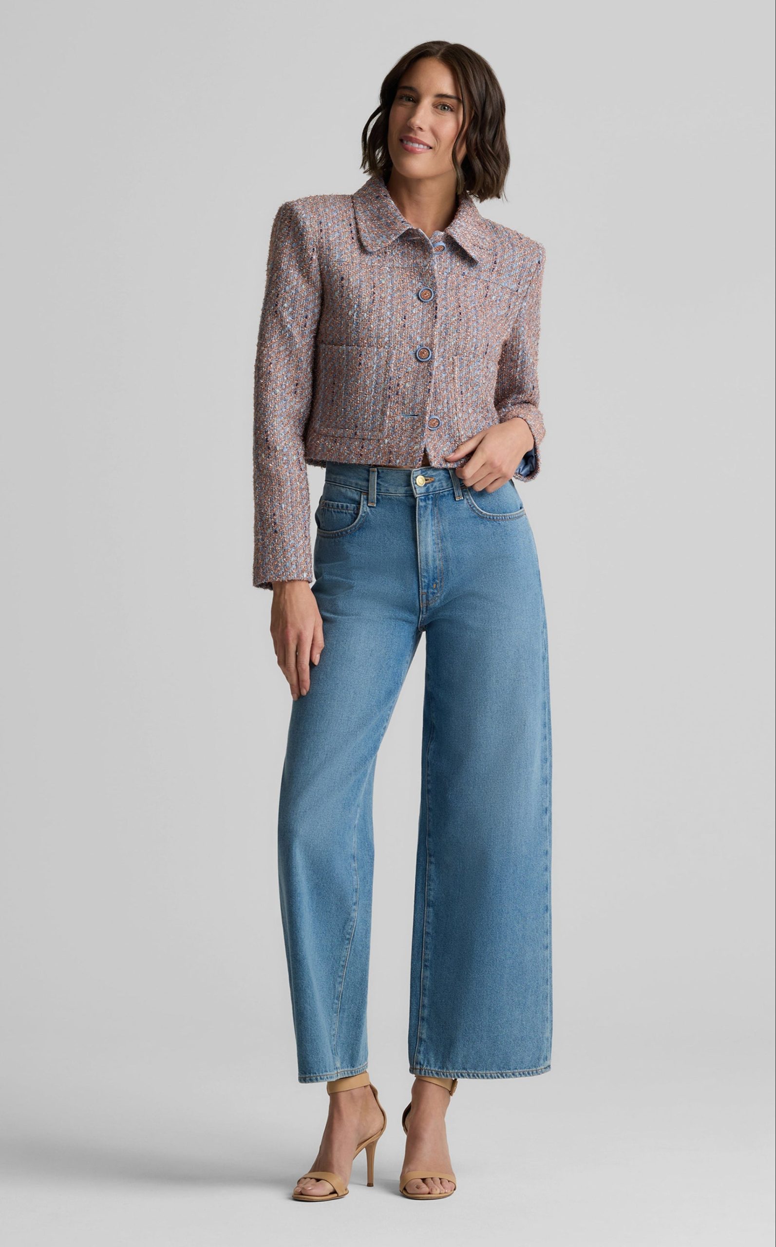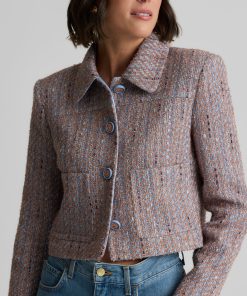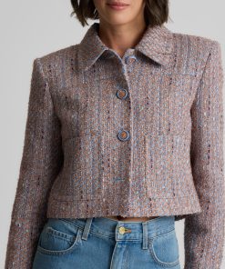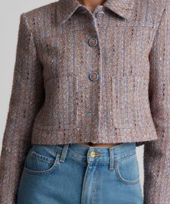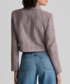 With its smart, sophisticated silhouette, this tweed jacket makes an elegant addition to any modern woman’s wardrobe, while its bejeweled buttons and subtly sparkling finish add a dose of dazzle that takes it easily into the evening.