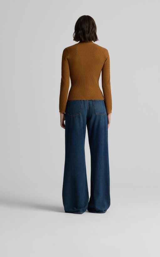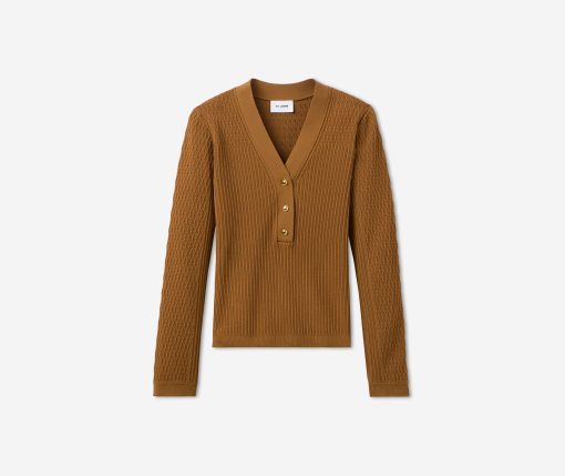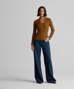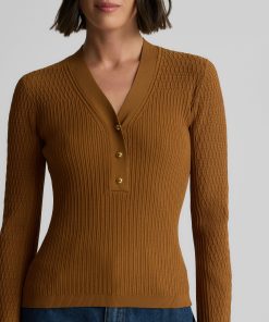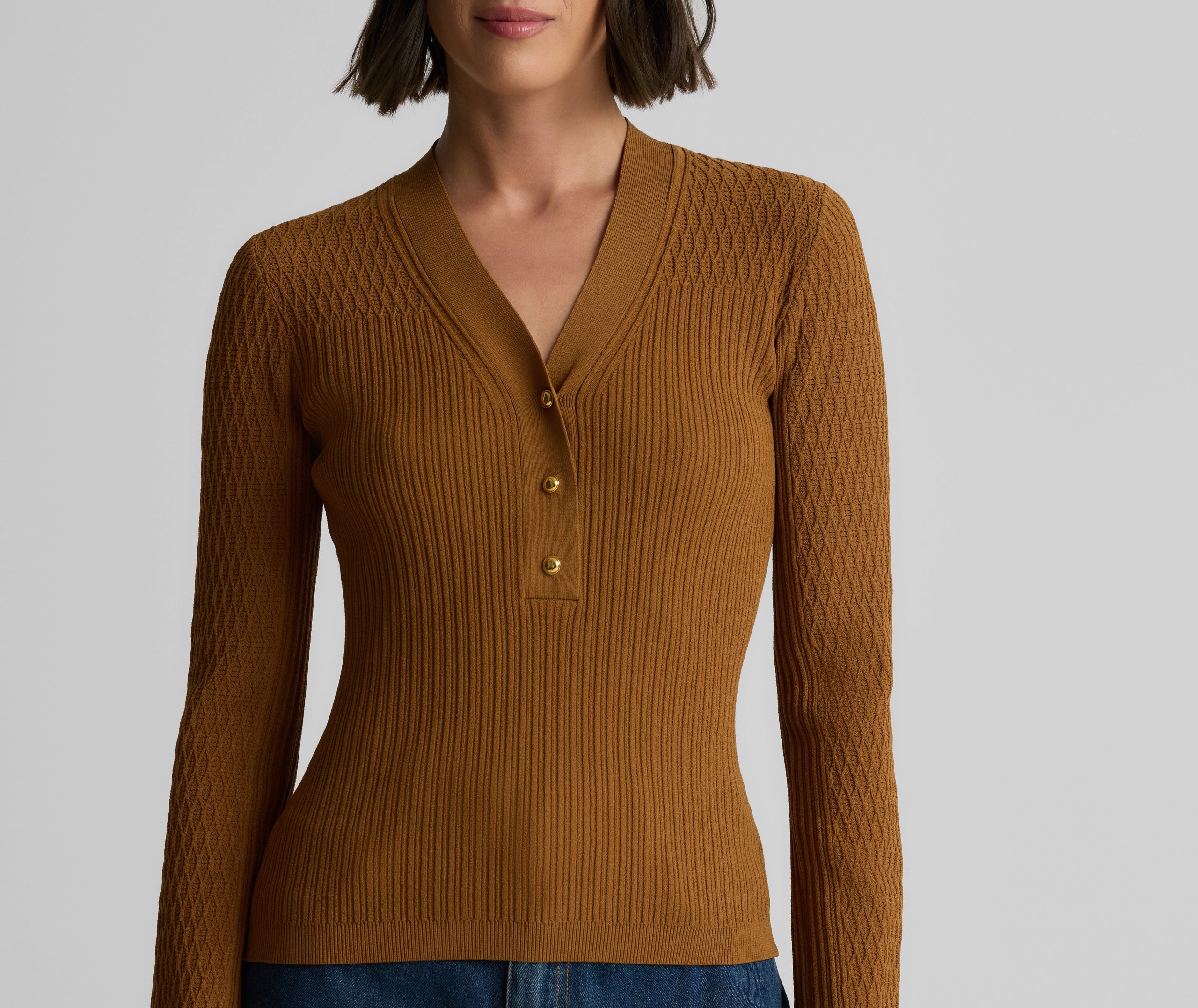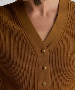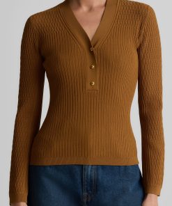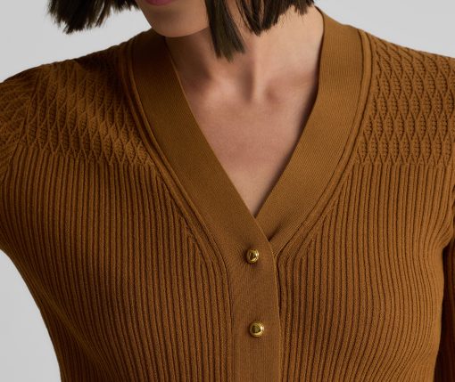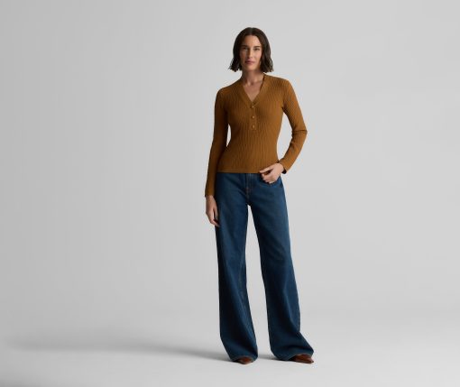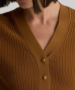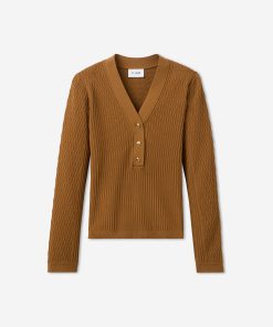 With its slim fit, graceful V-neckline, and delicate gold buttons, this fine ribbed knit sweater in warm, earthy Cinnamon will instantly become a treasured staple of the modern woman’s wardrobe. Wear the Remy to the office with tailored pants or on days off with denim—it brings effortless sophistication to every ensemble.