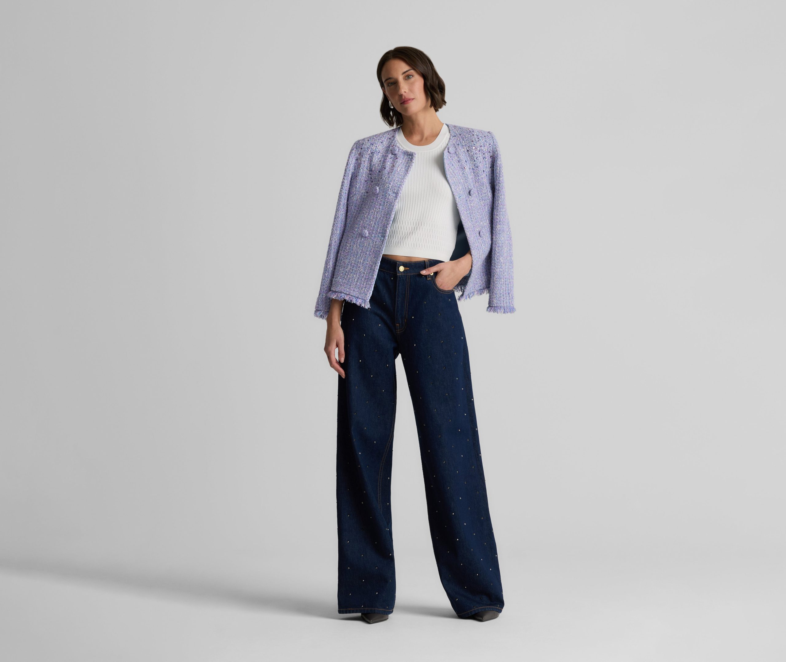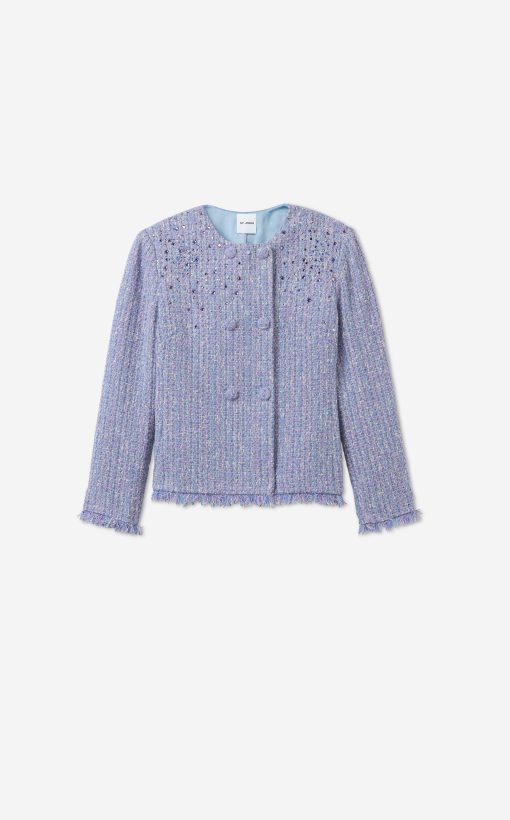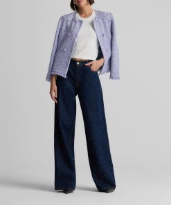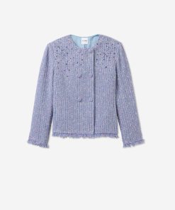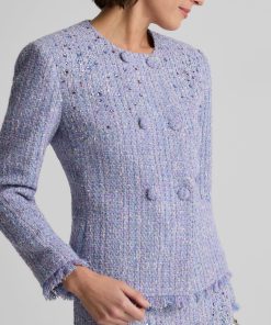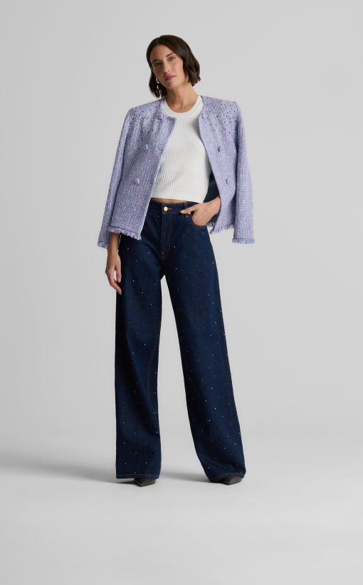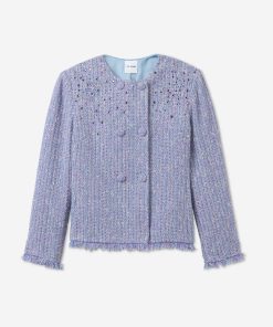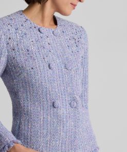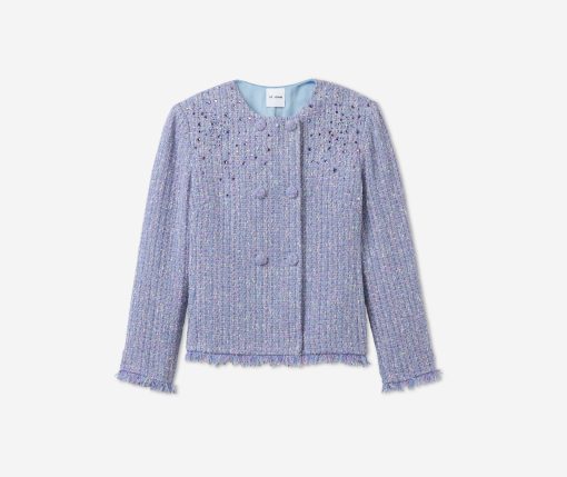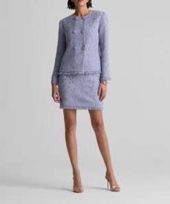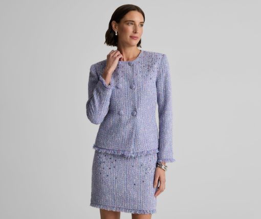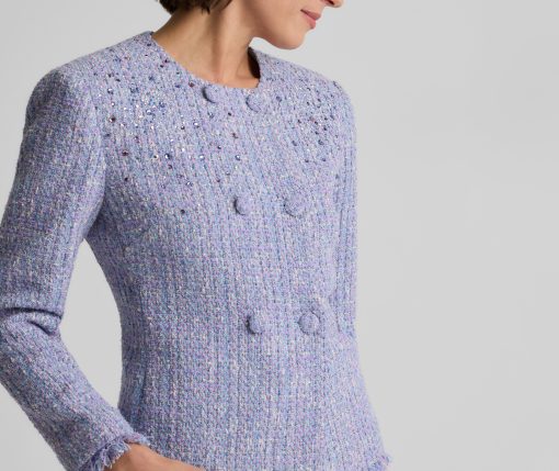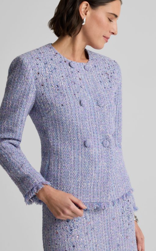 Balancing timeless sophistication and quiet opulence, the Sinclair Jacket features light-catching metallic stretch Monroe Tweed, shimmering embellishments, and fringed edges for a evening layer that is the epitome of elegance.