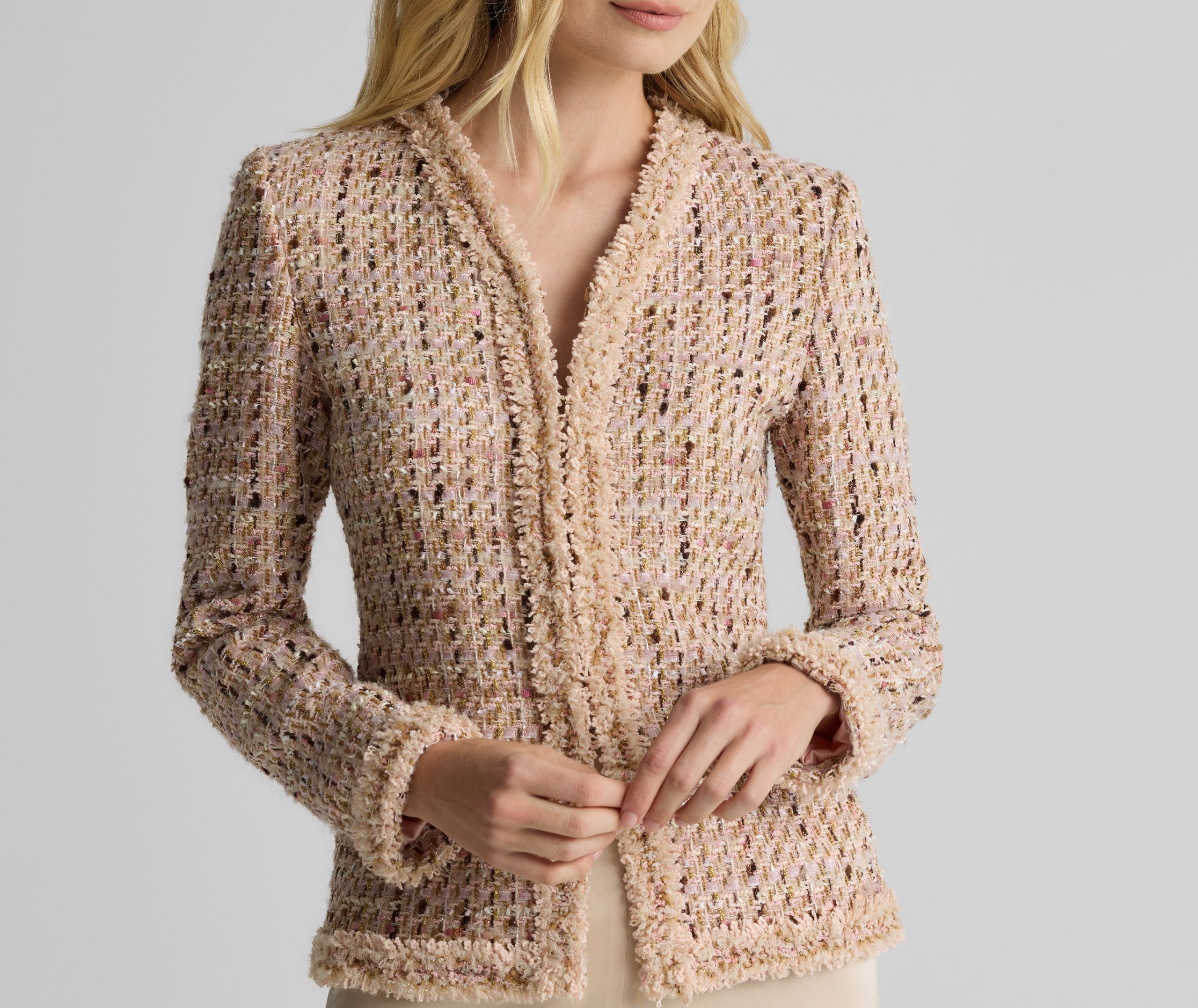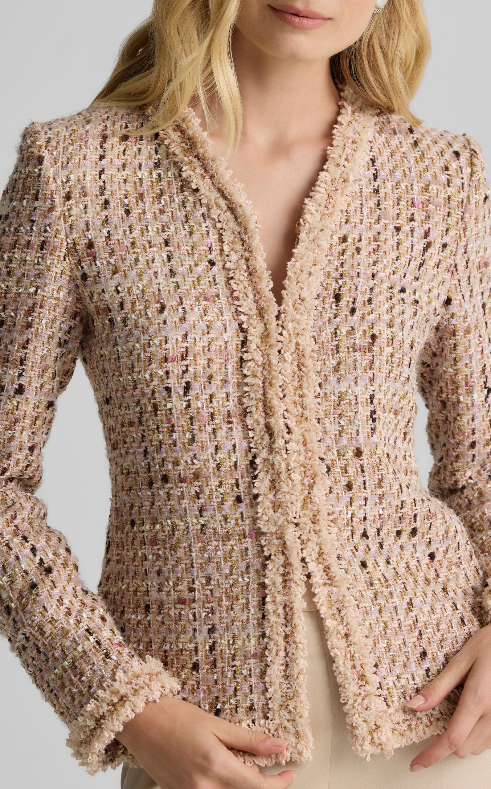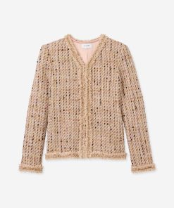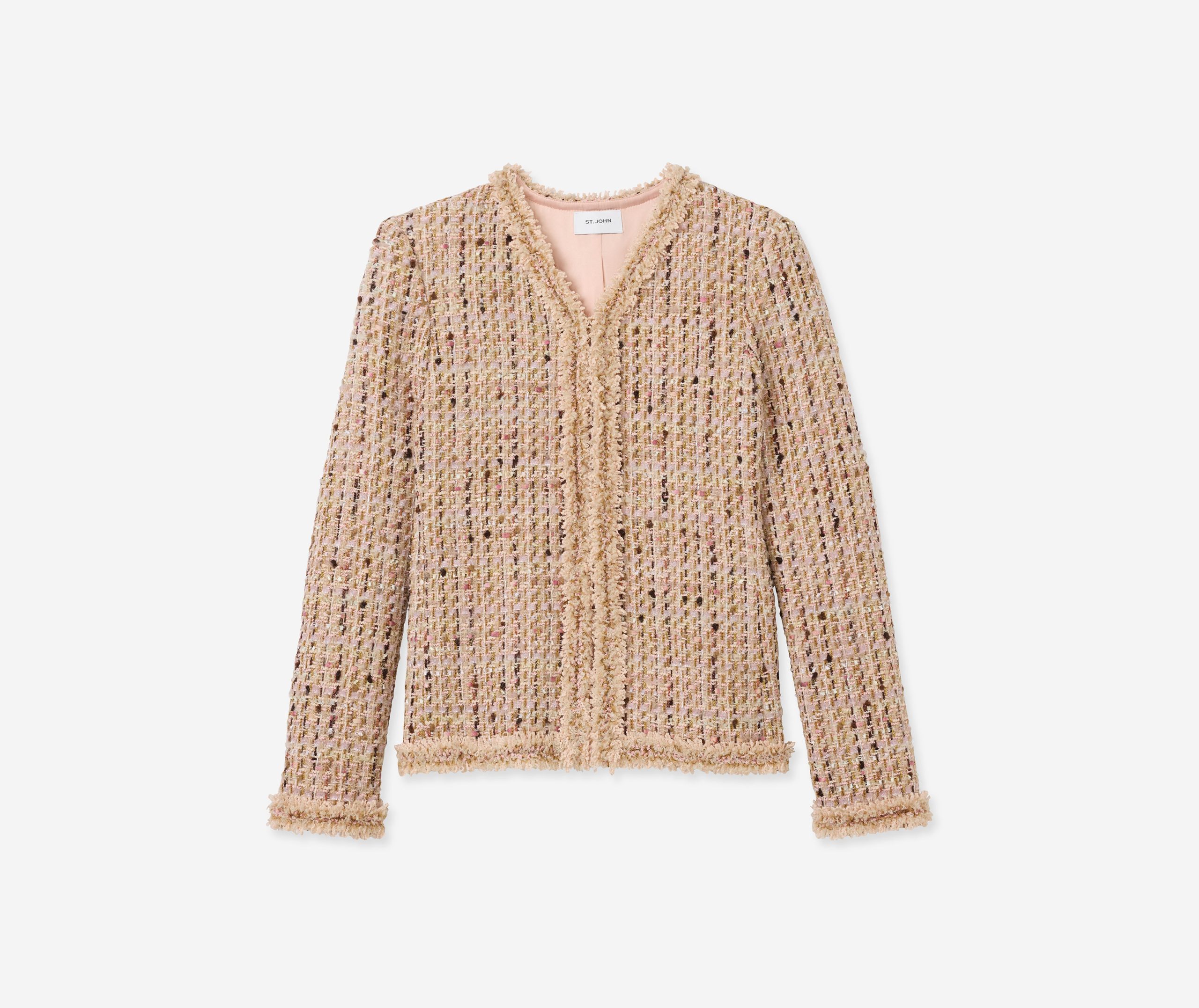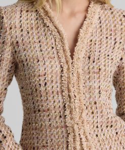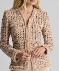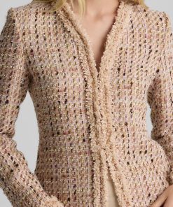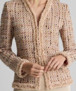 Made from our subtly shimmering Metallic Tweed and finished with playful fringe detail, the Susan features twice the texture for a truly unique addition to your wardrobe. To provide maximum wearability, this jacket’s slim, tailored fit and flattering V-neckline present a classically polished appearance that’s suited for office days and more elegant affairs alike.