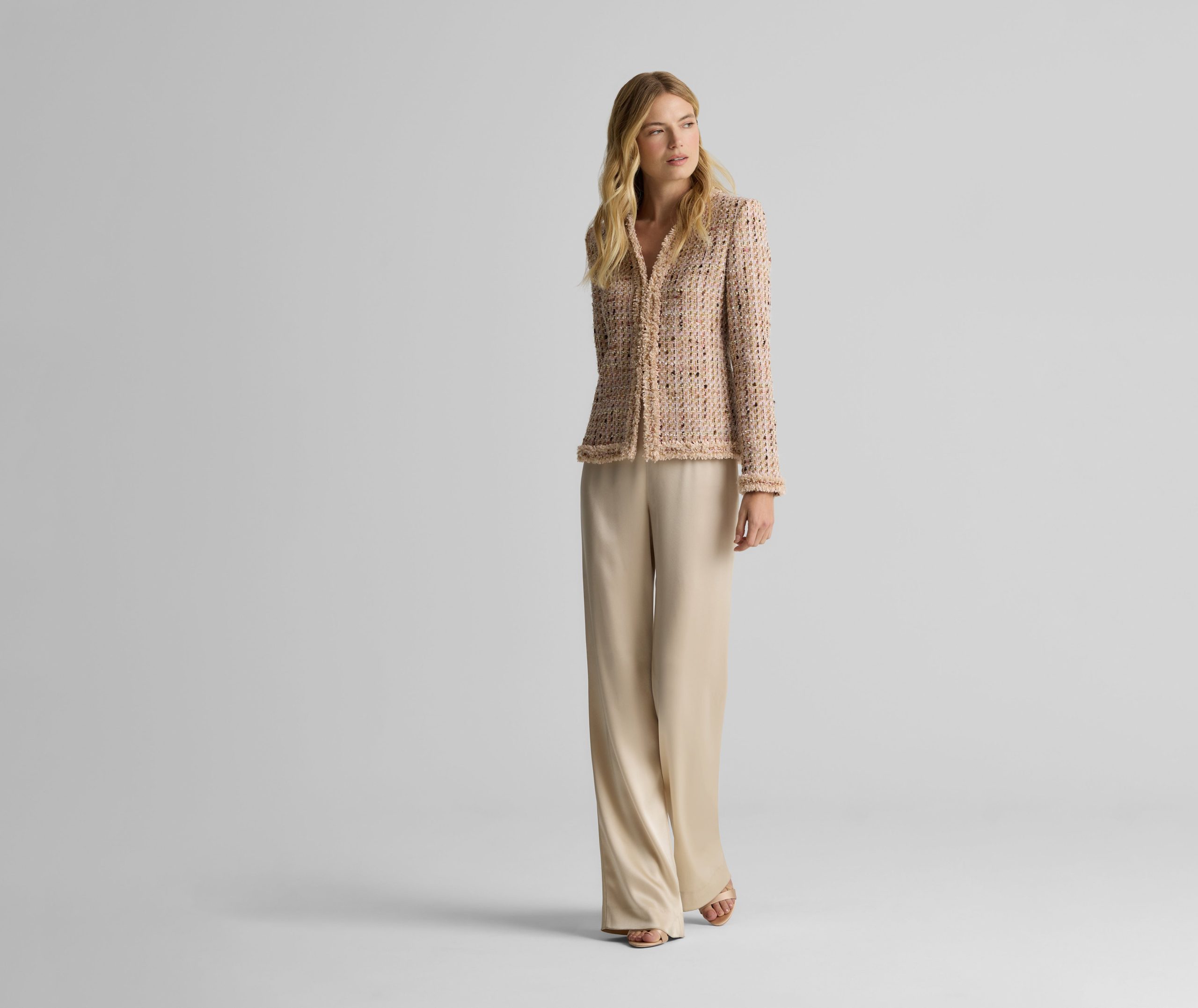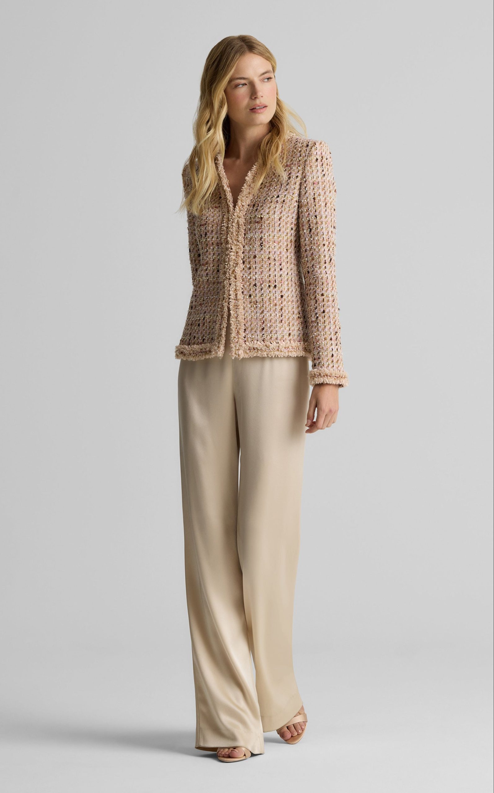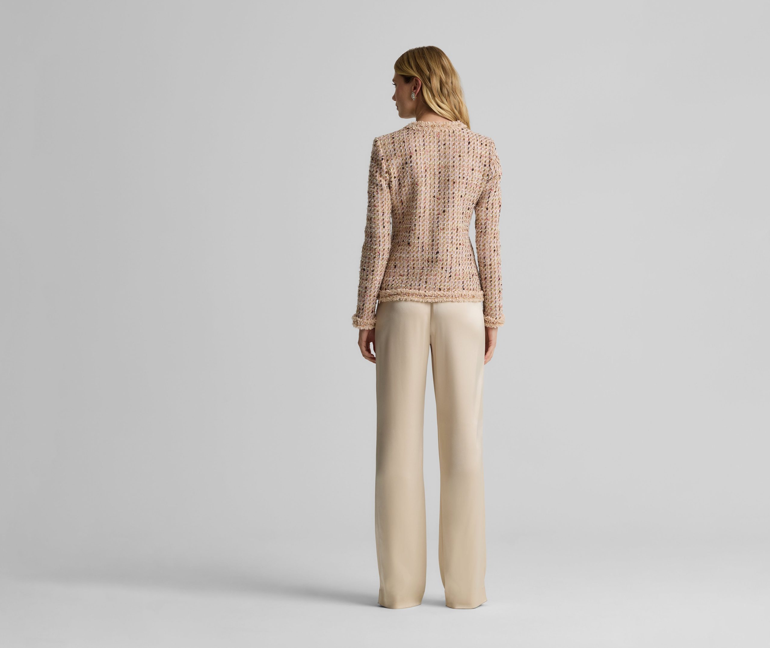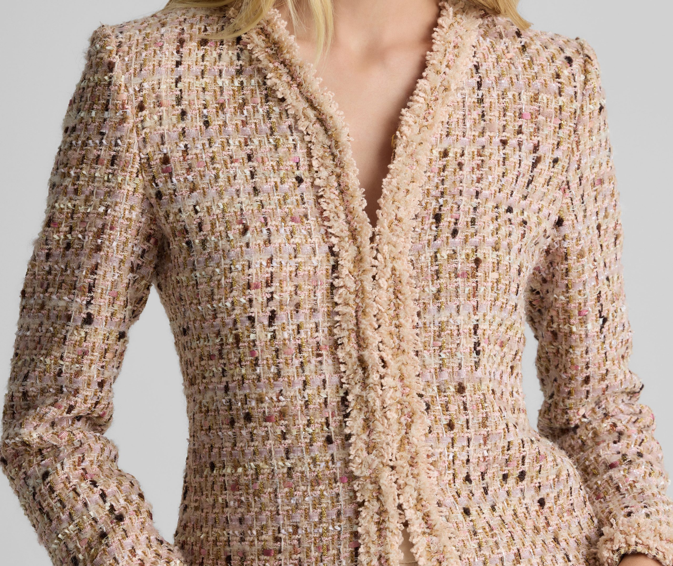 Made from our subtly shimmering Metallic Tweed and finished with playful fringe detail, the Susan features twice the texture for a truly unique addition to your wardrobe. To provide maximum wearability, this jacket’s slim, tailored fit and flattering V-neckline present a classically polished appearance that’s suited for office days and more elegant affairs alike.